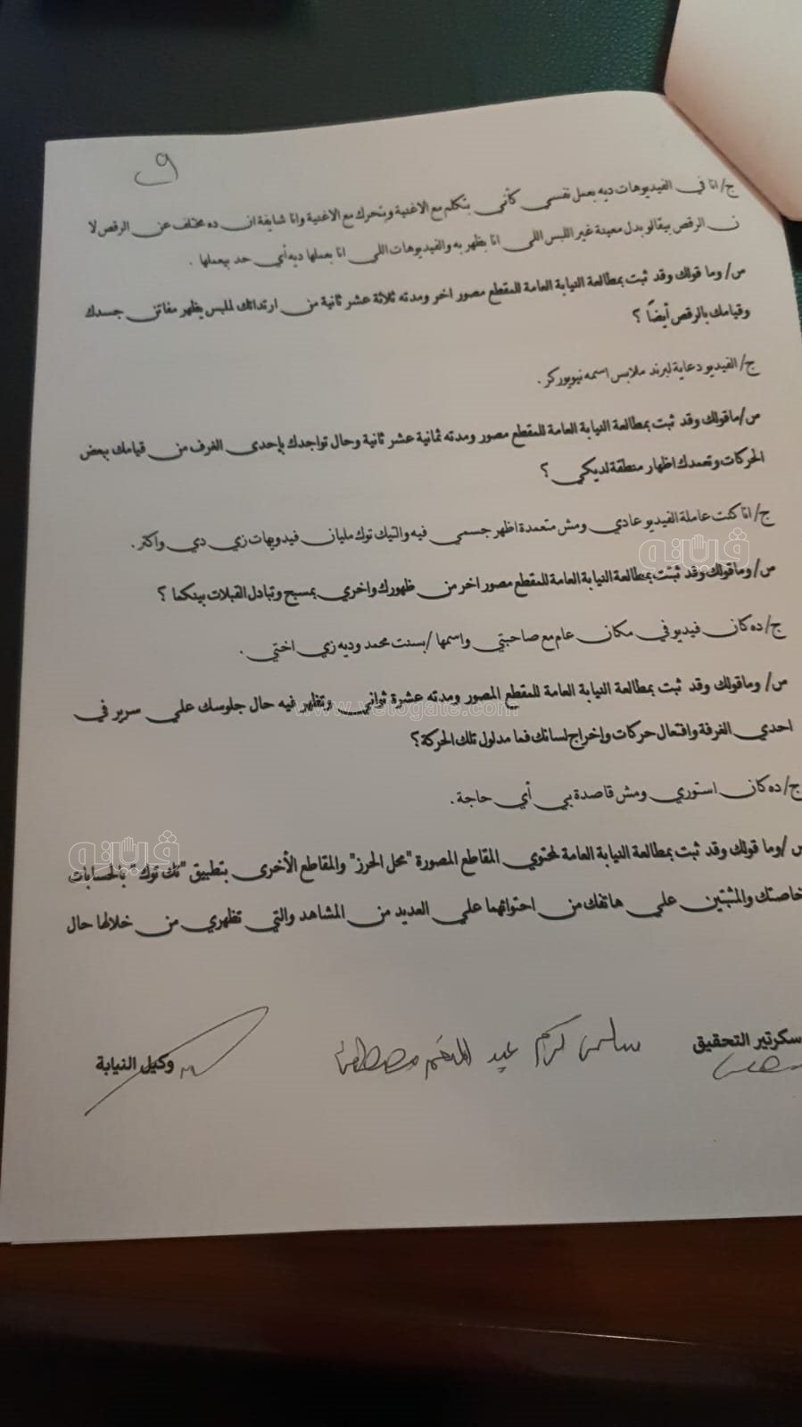 وقامت النيابة العامة بتوجيه سؤال للمتهمة عن الغرض من تصوير وإذاعة المقاطع المنتشرة على مواقع التواصل الاجتماعي، والتي تعد من المحتويات الإباحية، أجابت المتهمة بأنها تنشرها على سبيل الترفيه وليس لديها أي غرض آخر.