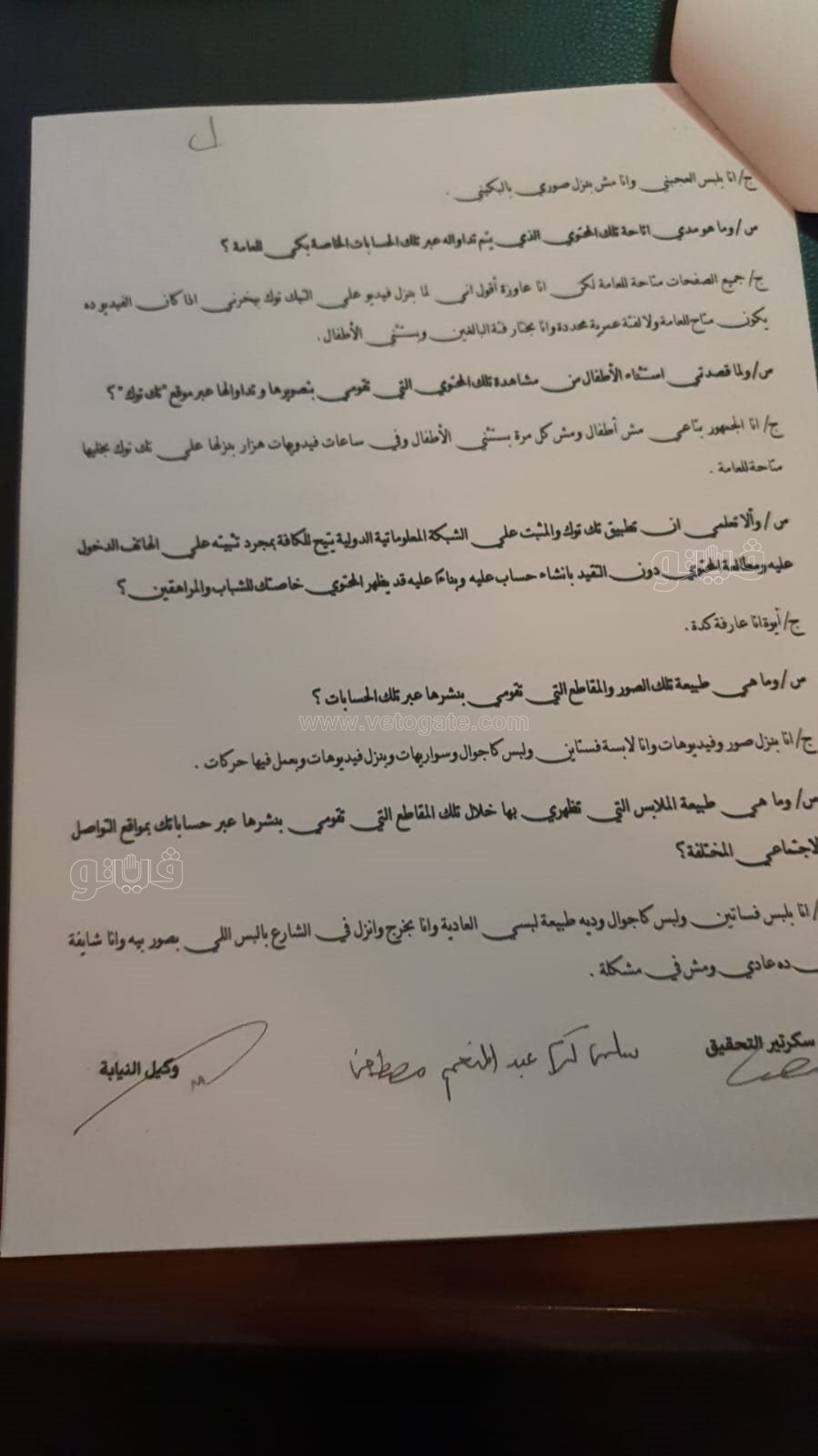 وأضافت خلال التحقيقات، "انا بنزل الشارع باللبس اللي بصور بيه وأنا شايفة إن لبسي عادي ومش ملفت".