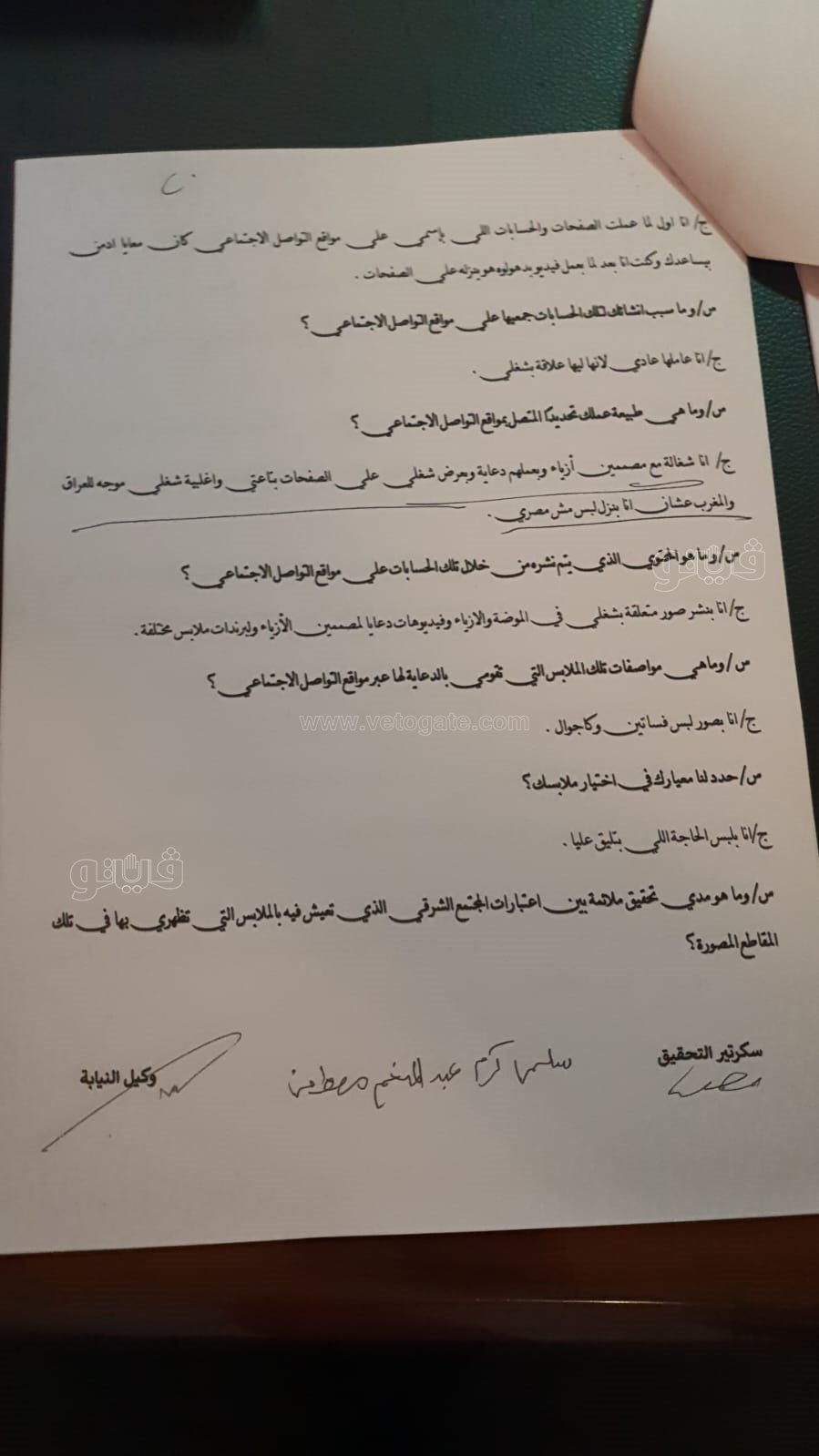 وقامت النيابة العامة بتوجيه سؤال للمتهمة عن طبيعة عملها على مواقع التواصل الاجتماعي، أجابت بأنها تعمل مع مصممين أزياء وبعملهم دعاية وبنشر شغلي على الصفحات بتاعتي وأغلبية شغلي موجه للعراق والمغرب علشان أنا بنزل شغل مش مصري.