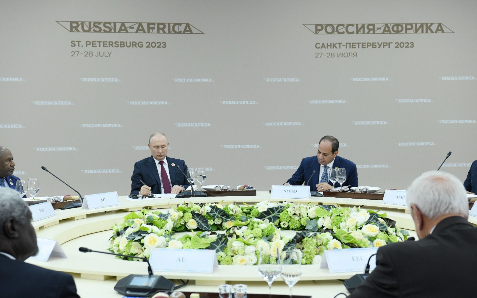 وشارك الرئيس عبد الفتاح السيسي، بمدينة سان بطرسبرج، في غداء عمل مع الرئيس الروسي فلاديمير بوتين، وذلك إلى جانب رؤساء الدول والحكومات الأفارقة من رؤساء التجمعات الاقتصادية الأفريقية المختلفة.