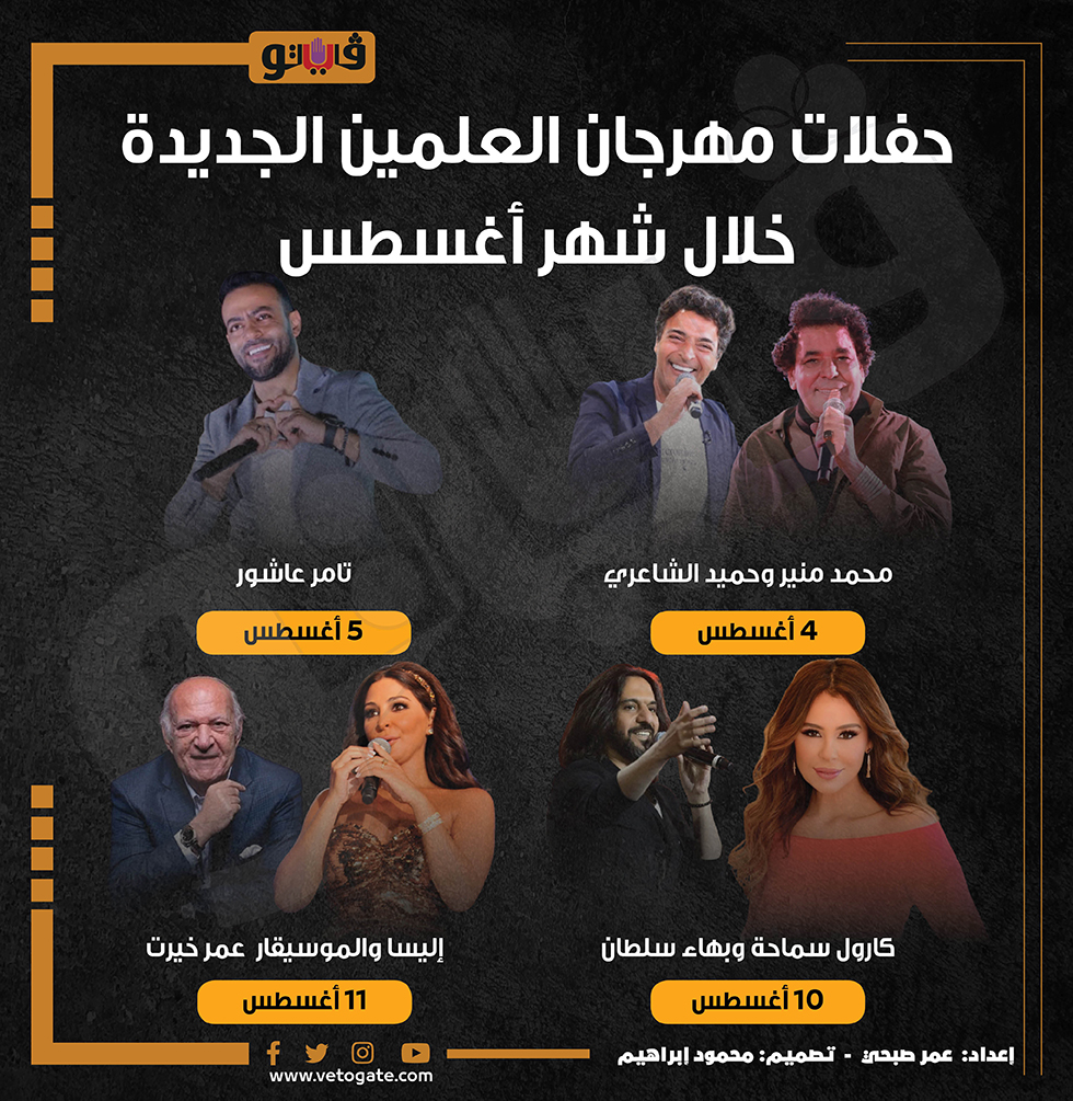 حفلات مهرجان العلمين الجديدة خلال شهر أغسطس (إنفوجراف) السبت 29/يوليو/2023 - 01:45 م 7/29/2023 1:45:20 PM حميد الشاعري وبهاء سلطان، فيتو عمر صبحي شارك طباعة 18 حجم الخط شارك طباعة محمد منير تامر عاشور كارول سماحة أغنية بهاء سلطان