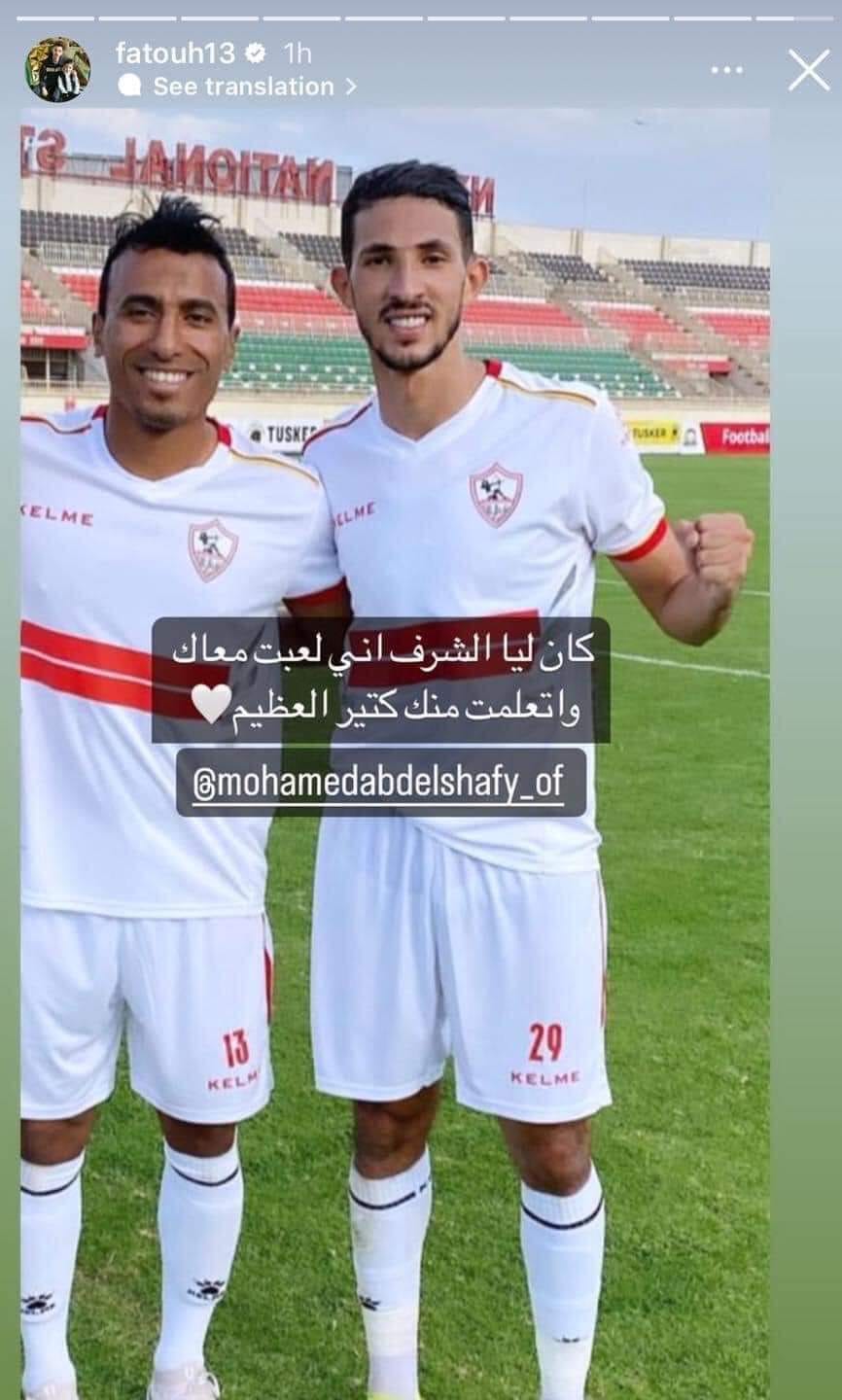 ونشر فتوح عبر حسابه على انستجرام صورة له مع محمد عبد الشافي معلقًا عليها: “كان ليا الشرف أني لعبت معاك واتعلمت منك ياعظيم”.