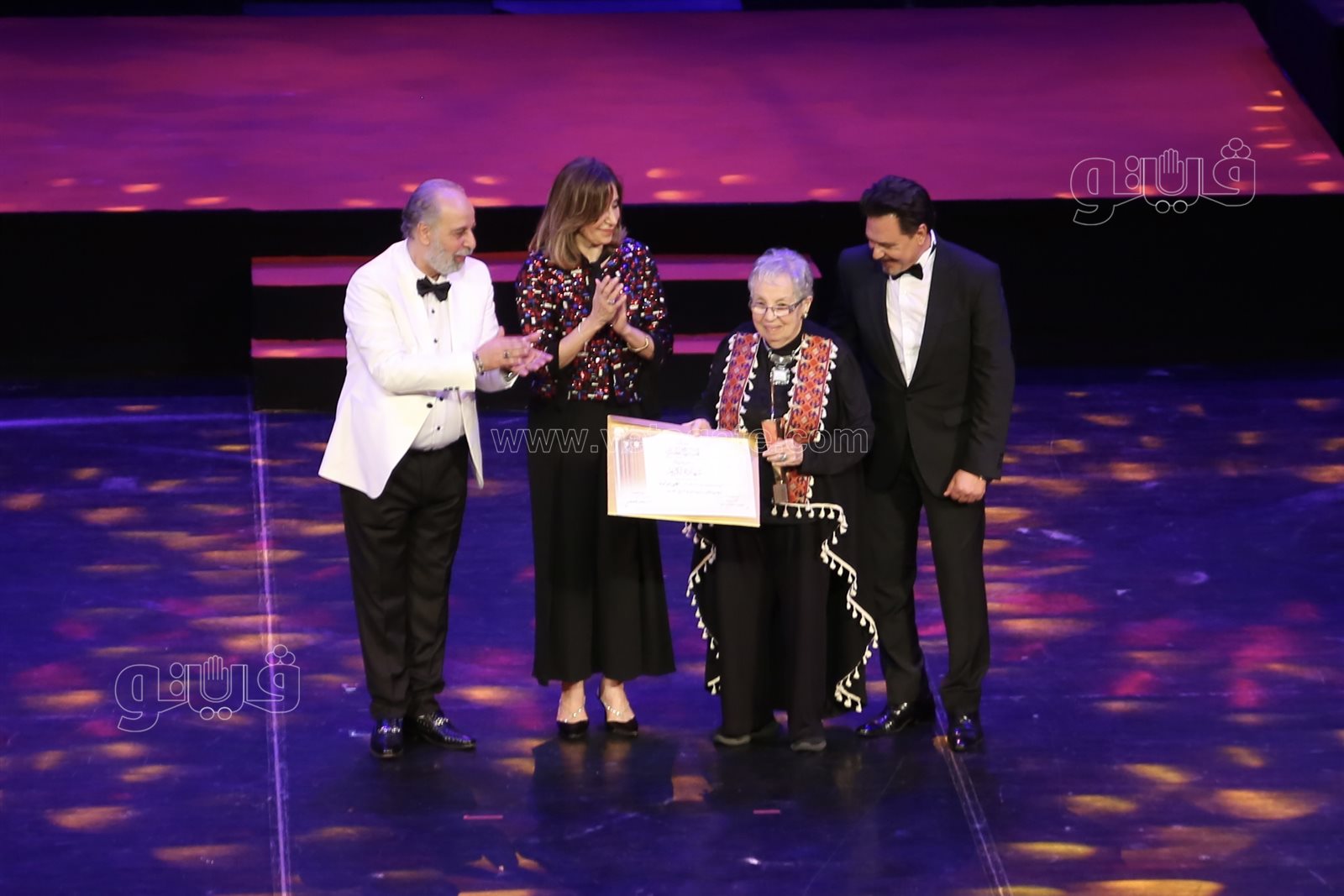 وسلمت الدكتورة نيفين الكيلاني وزيرة الثقافة، والفنان محمد رياض رئيس المهرجان، شهادة تقدير ودرع المهرجان لجميع المكرمين.