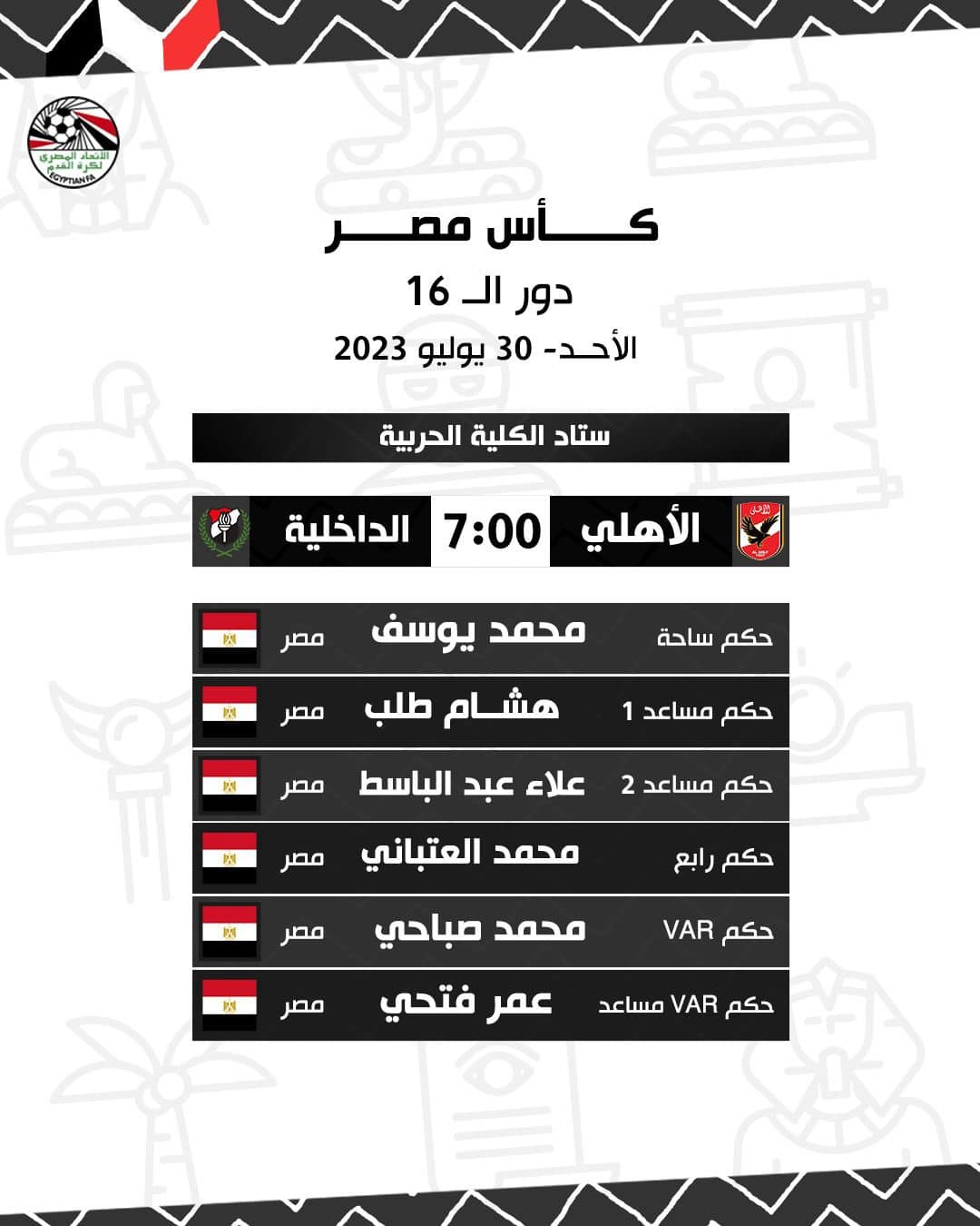 كأس مصر، أعلنت لجنة الحكام الرئيسية بالاتحاد المصري لكرة القدم عن طاقم تحكيم مباراة الأهلي والداخلية في اللقاء الذي سيجمع الفريقين في دور الـ16 من بطولة كأس مصر، والمقرر لها مساء غدًا الأحد في السابعة مساء على ملعب الكلية الحربية