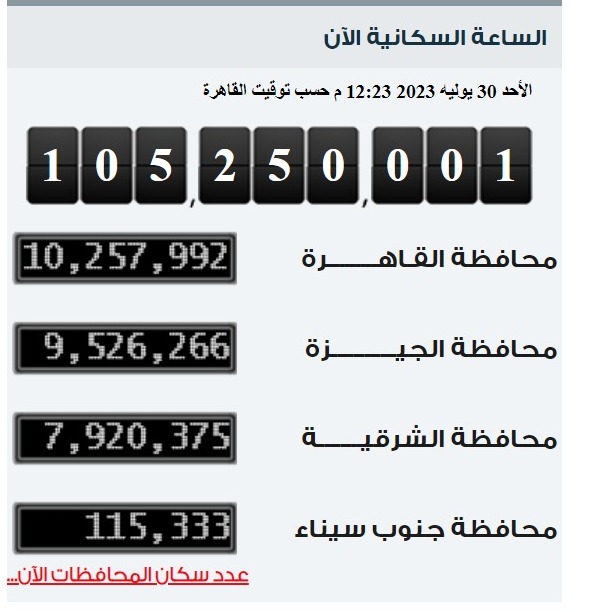أعلنت الساعة السكانية الموجودة أعلى مبنى الجهاز المركزي للتعبئة العامة والإحصاء اليوم عن وصول عدد سكان مصر بالداخل إلى 105 ملايين و250 ألف نسمة بزيادة قدرها 250 ألف نسمة خلال 57 يوما؛ حيث سجل عدد سكان مصر 105 ملايين نسمة بالداخل في الثالث من يونيو الماضي.