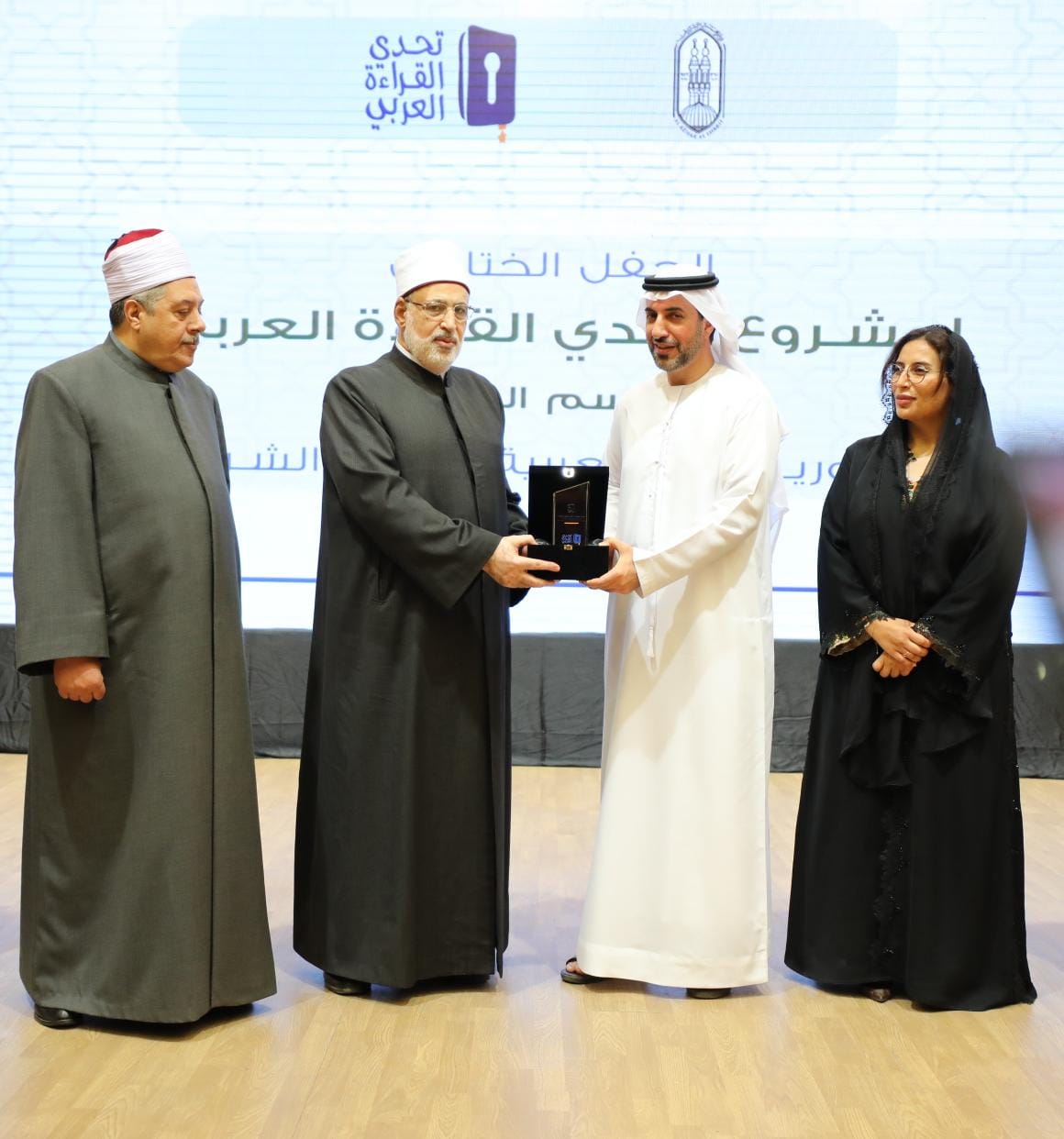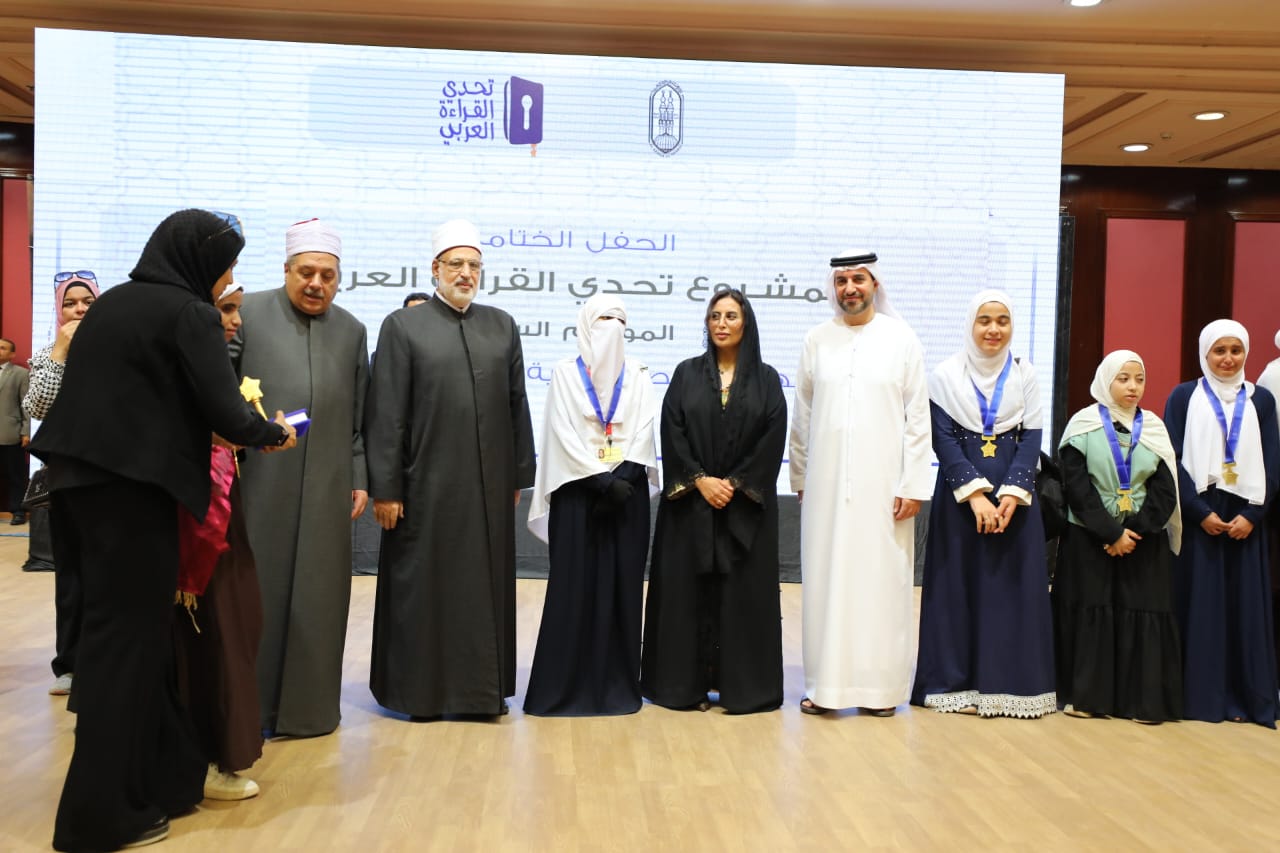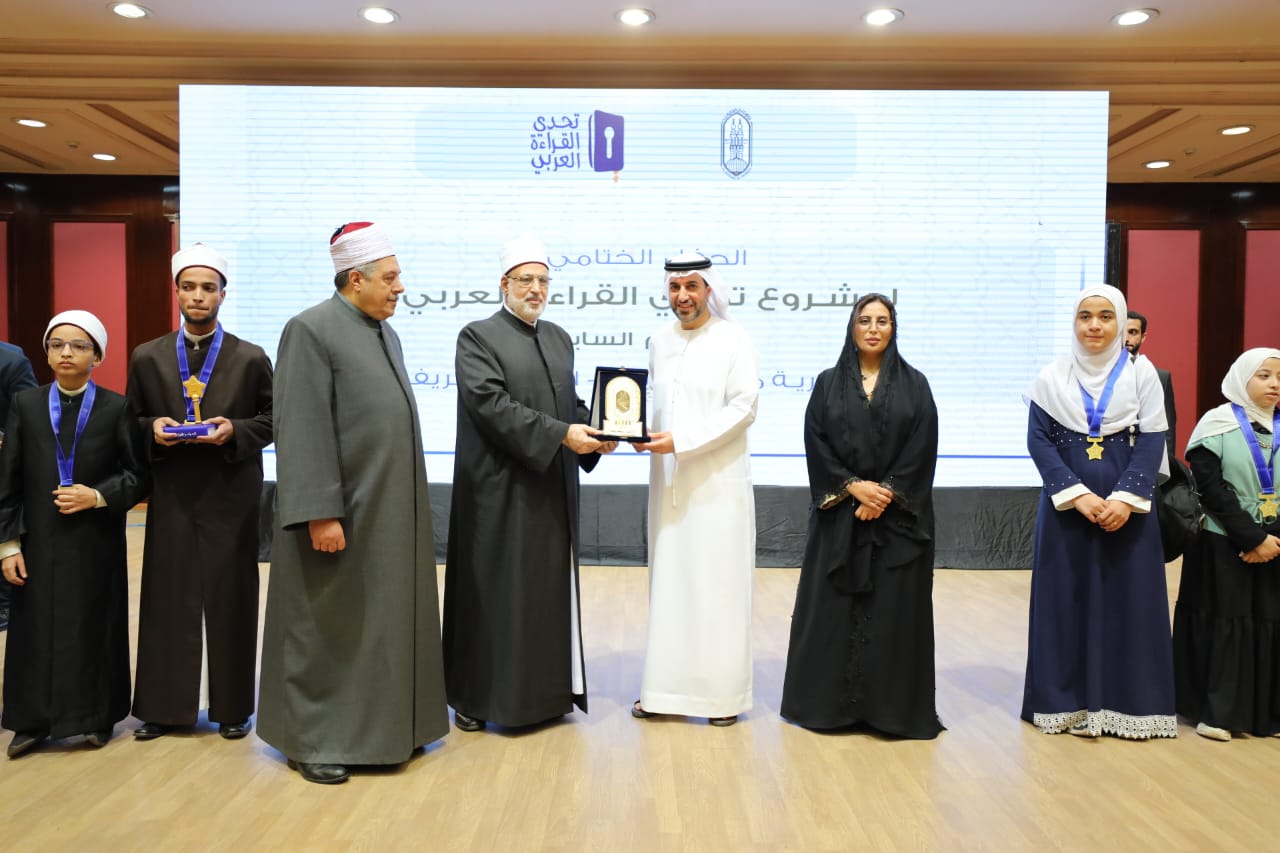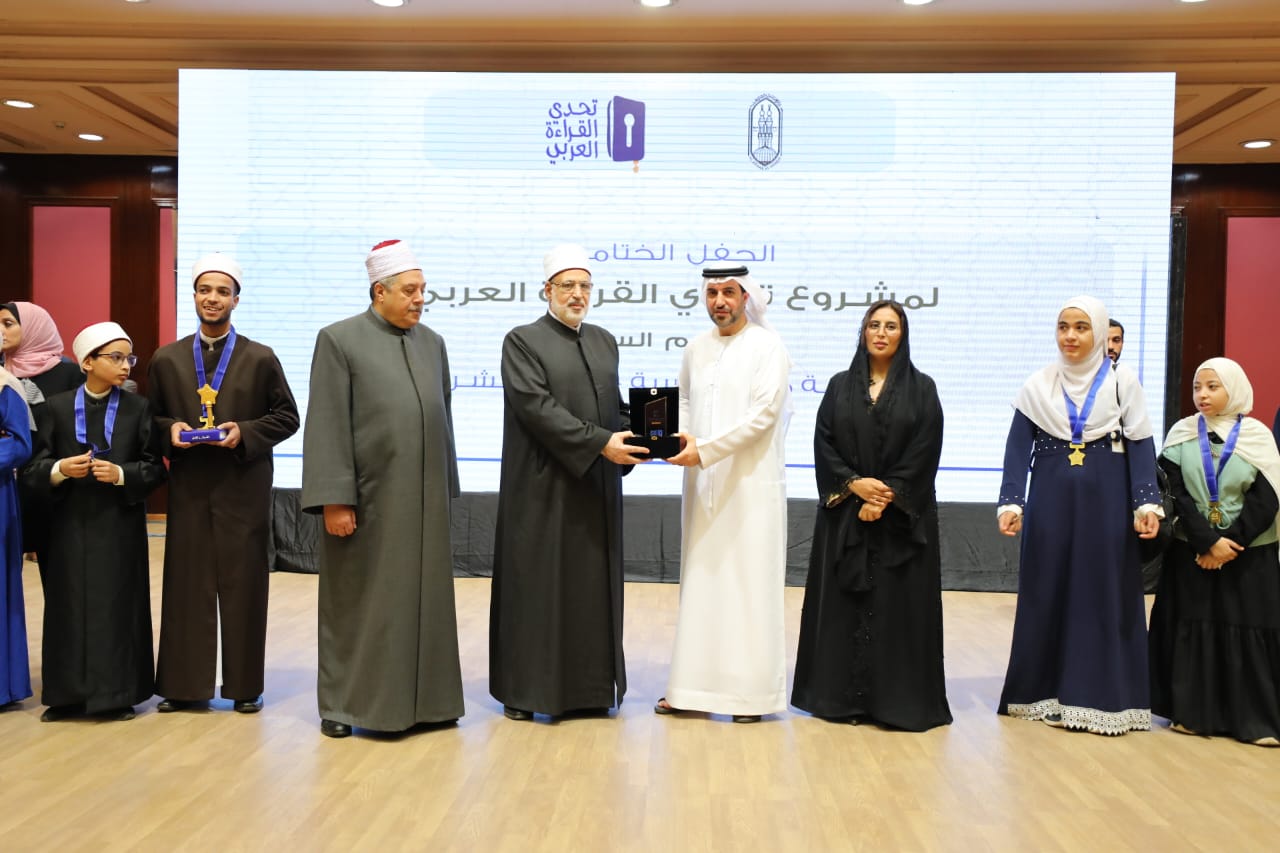 كرَّم الدكتور محمد الضويني، وكيل الأزهر، والسفيرة مريم الكعبي، سفيرة دولة الإمارات العربية المتحدة لدى جمهورية مصر العربية، والدكتور عبد الكريم العلماء، المدير التنفيذي بمؤسسة مبادرات محمد بن راشد العالمية، الطلاب الفائزين من الأزهر في المرحلة النهائية من مشروع «تحدي القراءة العربي» في نسخته السابعة، وذلك بمركز الأزهر للمؤتمرات.
