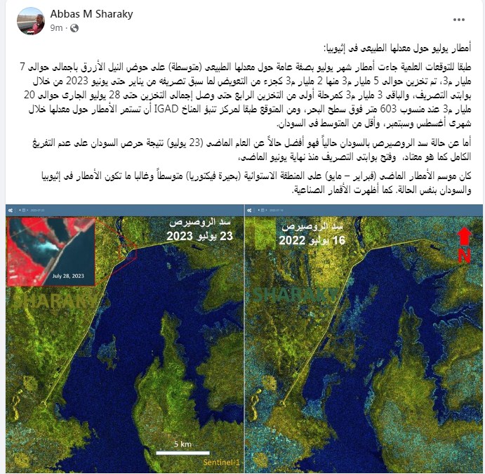وعن حالة سد الروصيرص قال الدكتور عباس شراقي: "أما عن حالة سد الروصيرص بالسودان حاليًا فهو أفضل حالًا عن العام الماضى (23 يوليو) نتيجة حرص السودان على عدم التفريغ الكامل كما هو معتاد، وفتح بوابتى التصريف منذ نهاية يونيو الماضى".