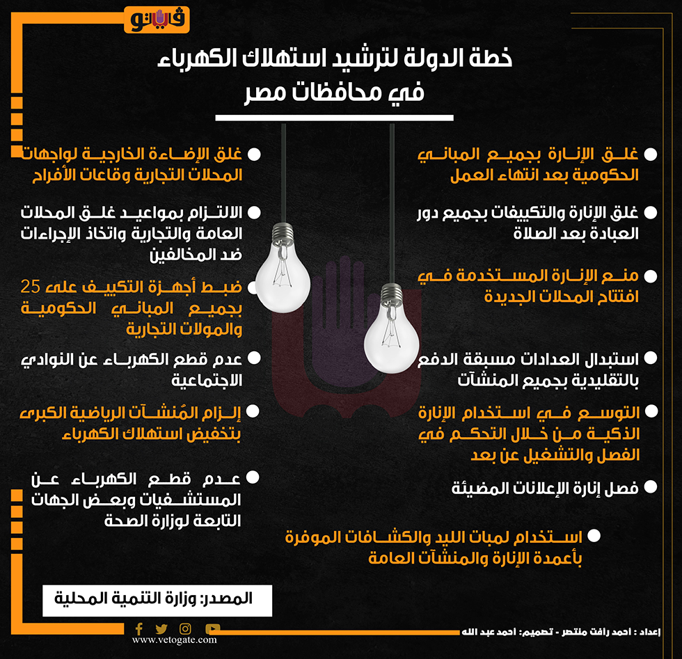 قرارات مجلس الوزراء خطة الدولة لترشيد استهلاك الكهرباء في محافظات مصر (إنفوجراف) الأحد 30/يوليو/2023 - 07:29 م 7/30/2023 7:29:19 PM خطة الدولة لترشيد استهلاك الكهرباء، فيتو أحمد رأفت منتصر شارك طباعة 18 حجم الخط شارك طباعة ترشيد استهلاك الكهرباء خطة ترشيد استهلاك الكهرباء قرارات مجلس الوزراء قرارات رئيس الوزراء