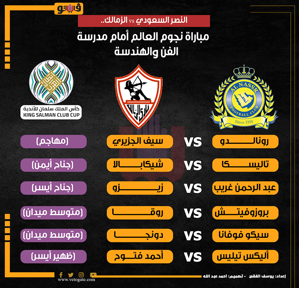 النصر السعودي vs الزمالك.. مباراة نجوم العالم أمام مدرسة الفن والهندسة (إنفوجراف) الإثنين 31/يوليو/2023 - 09:59 ص 7/31/2023 9:59:51 AM النصر السعودي والزمالك، فيتو يوسف الفقي شارك طباعة 18 حجم الخط شارك طباعة رونالدو زيزو البطولة العربية الزمالك شيكابالا الزمالك والنصر مباراة الزمالك والنصر السعودي الزمالك في البطولة العربية