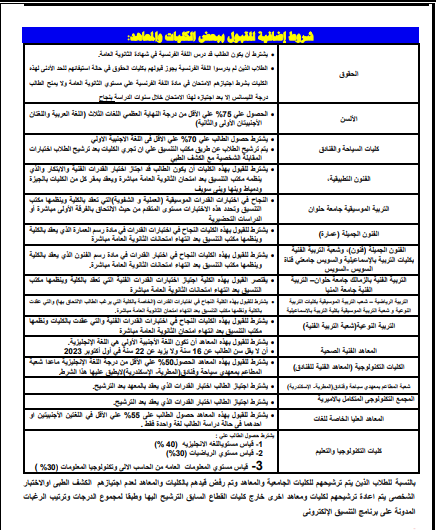 شروط اضافية للقبول ببعض الكليات والمعاهد في تنسيق الجامعات 2023