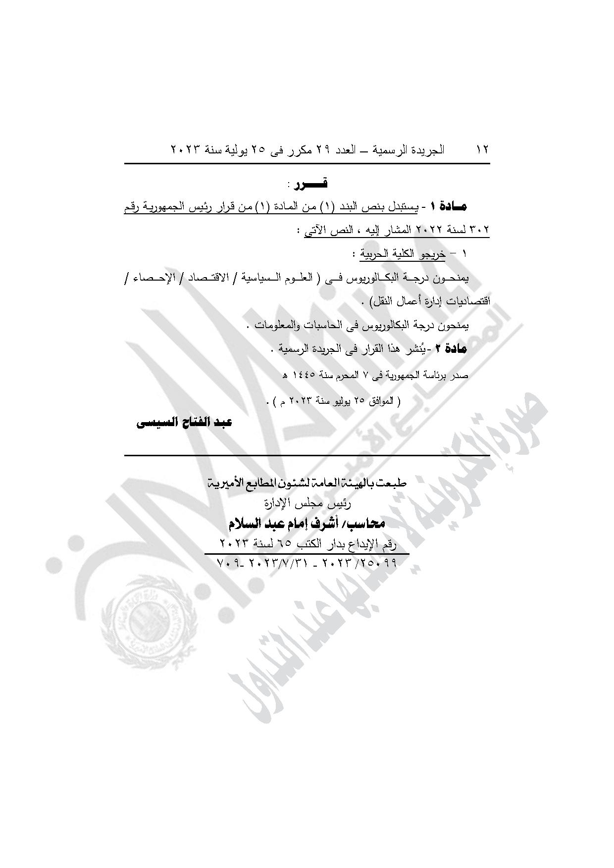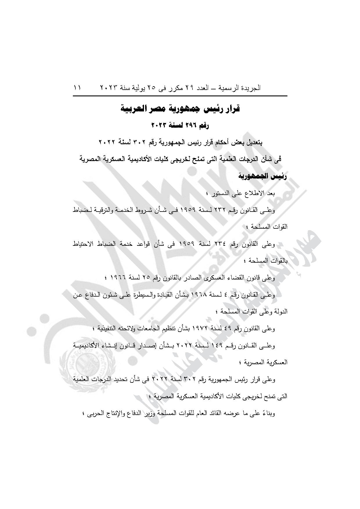نشرت الجريدة الرسمية في عددها رقم 29 مكرر، الصادر في 25 يوليو 2023، قرار جمهوري جديد للرئيس عبد الفتاح السيسي رقم 296 لسنة 2023، بتعدیل بعض أحكام قرار رئیس الجمهوریة رقم ٣٠٢ لسنة ٢٠٢٢ فى شأن الدرجات العلمیة التى تمنح لخریجى ١١ كلية وأكاديمية عسكرية.