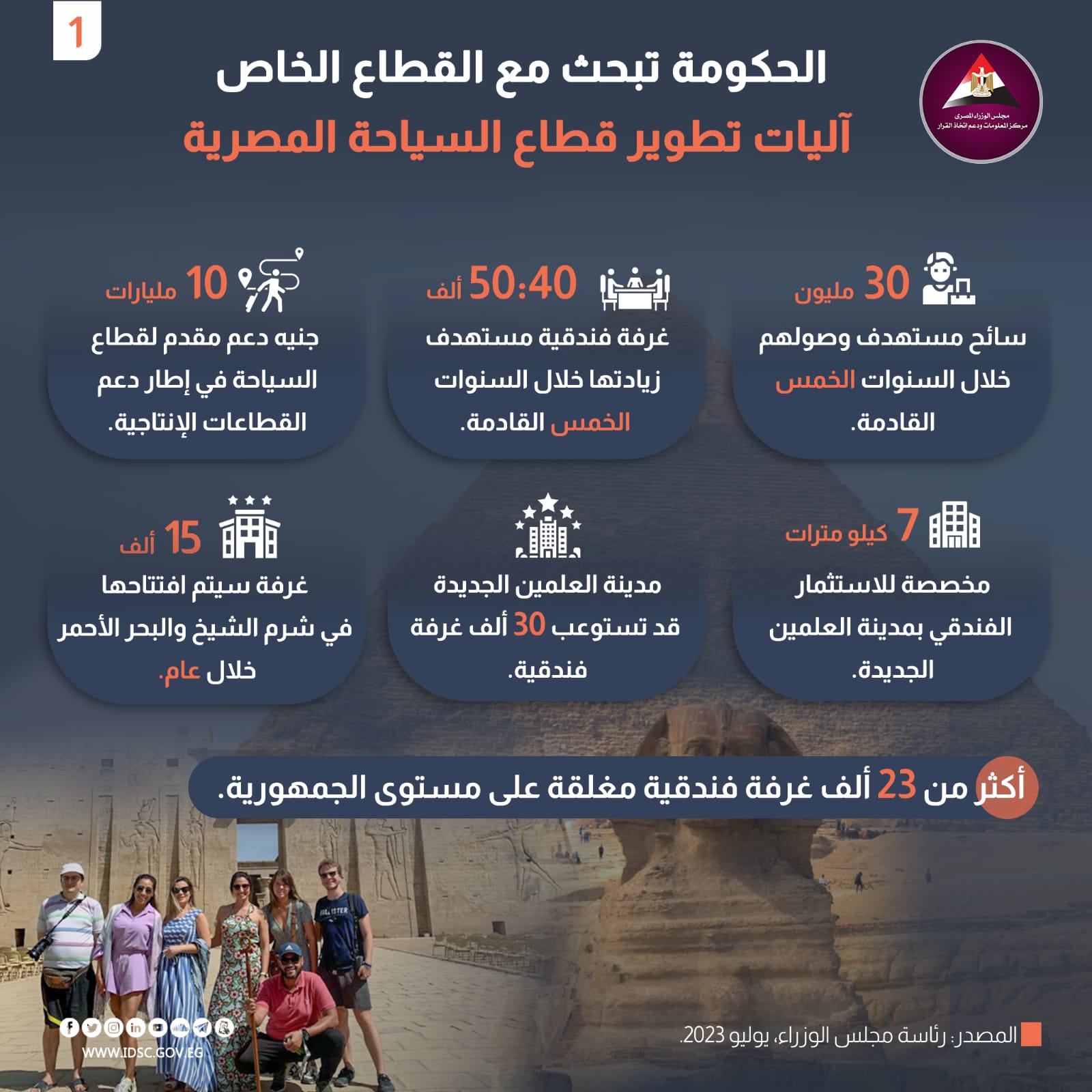 كما تضع الدولة حاليًّا ضمن خططها التطويرية للقطاع البحث مع القطاع الخاص عن آليات للتنمية السياحية في مصر، لمساعدة الحكومة في تحقيق مستهدفاتها بجذب 30 مليون سائح مستهدف خلال السنوات الخمس القادمة، وزيادة الغرف الفندقية بنحو 50 ألف غرفة خلال الفترة نفسها، منها 15 ألف غرفة في شرم الشيخ والبحر الأحمر مقرر افتتاحها خلال عام، وفي هذا الإطار قدمت الحكومة دعما بنحو 10 مليارات جنيه لقطاع السياحة في إطار دعم القطاعات الإنتاجية، وخصصت 7 كيلو مترات للاستثمار الفندقي بمدينة العلمين الجديدة، وتعمل على توفير أكبر عدد ممكن من الطائرات مُنخفضة التكاليف؛ لزيادة أعداد السائحين الوافدين. وتسهيلا ودعما للقطاع الخاص والمستثمرين ستمنح الحكومة "الرخصة الذهبية" للمشروعات السياحية المستكملة مستنداتها في مدة أقصاها 20 يومًا.
