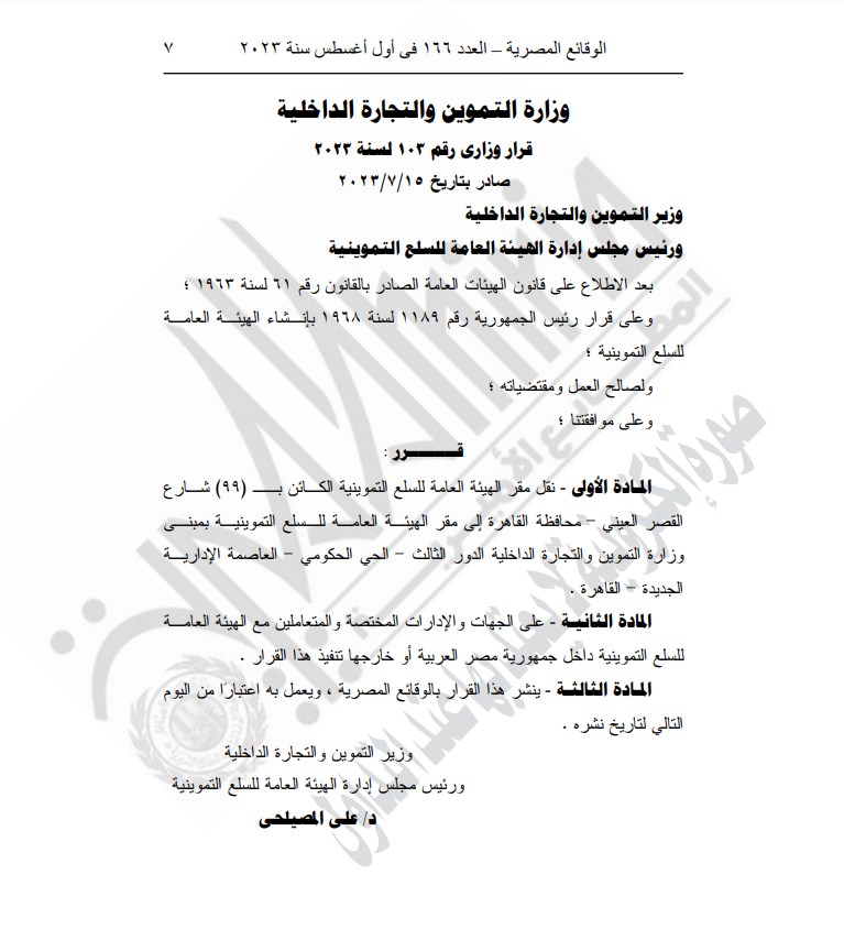 نشرت جريدة الوقائع المصرية في عددها رقم 166، الصادر أول أغسطس 2023، قرار وزارة التموين والتجارة الداخلية رقم 103 لسنة 2023، بشأن نقل مقر الهيئة العامة للسلع التموينية للعاصمة الإدارية الجديدة.