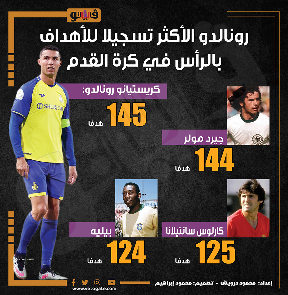 رونالدو الأكثر تسجيلا للأهداف بالرأس في كرة القدم (إنفوجراف) الخميس 03/أغسطس/2023 - 01:06 م 8/3/2023 1:06:18 PM رونالدو محمود درويش شارك طباعة 18 حجم الخط شارك طباعة رونالدو كارلوس سانتيلانا بيليه مولر كريستيانو رونالدو