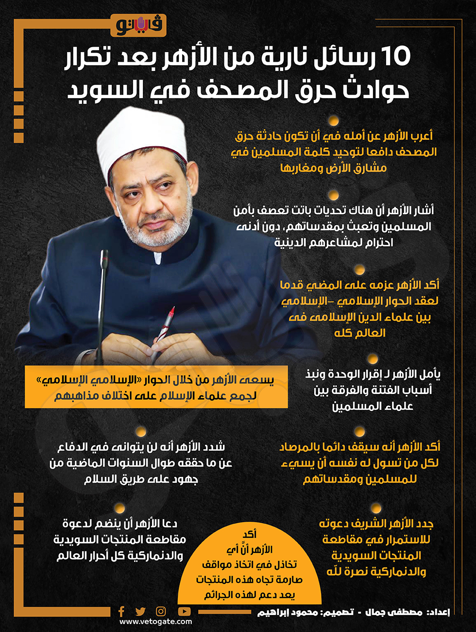 10 رسائل نارية من الأزهر بعد تكرار حوادث حرق المصحف في السويد (إنفو جراف) الثلاثاء 01/أغسطس/2023 - 06:51 م 8/1/2023 6:51:50 PM الدكتور أحمد الطيب، شيخ الأزهر الشريف، فيتو مصطفى جمال شارك طباعة 18 حجم الخط شارك طباعة حرق المصحف في السويد الازهر حادثة حرق المصحف علماء الدين الإسلامى علماء المسلمين مقاطعة المنتجات السويدية الحوار الإسلامي الإسلامي