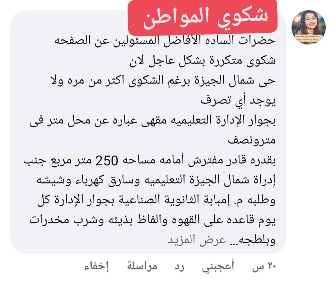تلقت الصفحة الرسمية لمحافظة الجيزة شكوي المواطنين الخاصة بوجود تعديات لمقهي بجوار الإدارة التعليمية بشمال الجيزة متعد علي الطريق العام وأرصفة المشاه بوضع كراسي وترابيزات واحتلال الأرصفة وإعاقة حركة المارة والسيارات.