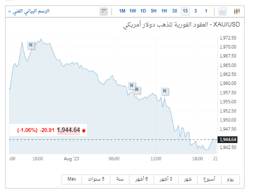 الذهب في اتجاه هبوط على الرسم البياني اليومي، والهدف المرتقب هو الصعودي التالى هو 2000 دولار لعقود فيوتشرز للذهب ولكن مع ذلك هناك مقاومة عنيفة لهذا السعر، وتشهد أسعار الذهب هبوطا طفيفا اليوم في حركة التداولات بالبورصة العالمية بعد أن تسببت بيانات الوظائف الأمريكية خلال الأسبوع الماضي في شكوك بشأن قوة سوق العمل الأمريكي وبالتالي مسار أسعار الفائدة القادم، حيث انخفض سعر الذهب عند المستوى 1944 دولار للأونصة ليشهد تغيرات حول هذا المستوى، كما سجل استقرار بنسبة تقدر بـ 1.05 %، ليسجل عيار 24 حوالي 2448.74 جنيه للجرام الواحد للطلب في السوق المحلي المصري.
