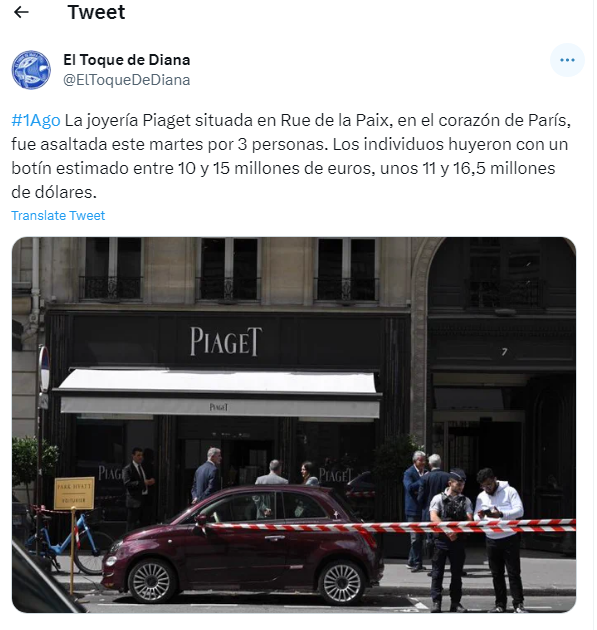 ووقعت حادثة السطو مع توقيت استراحة الغداء في المتجر الواقع بشارع رو دو لا بيه في منطقة بلاس فاندوم الراقية التي توجد فيها عدة متاجر مجوهرات وساعات وسلع فاخرة.