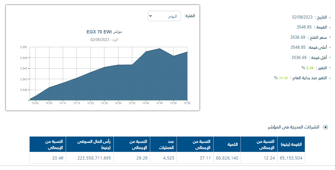بدأت مؤشرات البورصة المصرية حركة التعاملات اليوم الثانى من أغسطس بتباين لـمؤشراتها ، وبمستهل تعاملات اليوم الأربعاء وبعد انتهاء الساعة على حركة التعاملات للأفراد والمؤسسات، تراجع مؤشر "إيجي إكس 30" بنسبة 0.02% عند مستوى 17510 نقاط، بينما صعد مؤشر الشركات الصغيرة والمتوسطة "إيجي إكس 70 متساوي الأوزان" بنسبة 0.25% عند مستوى 3545 نقطة.