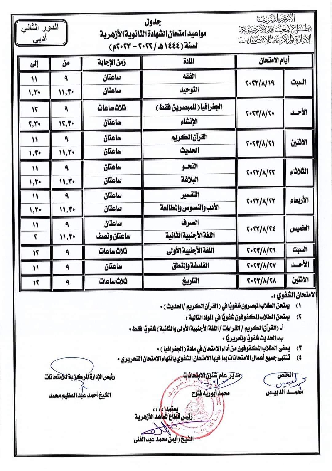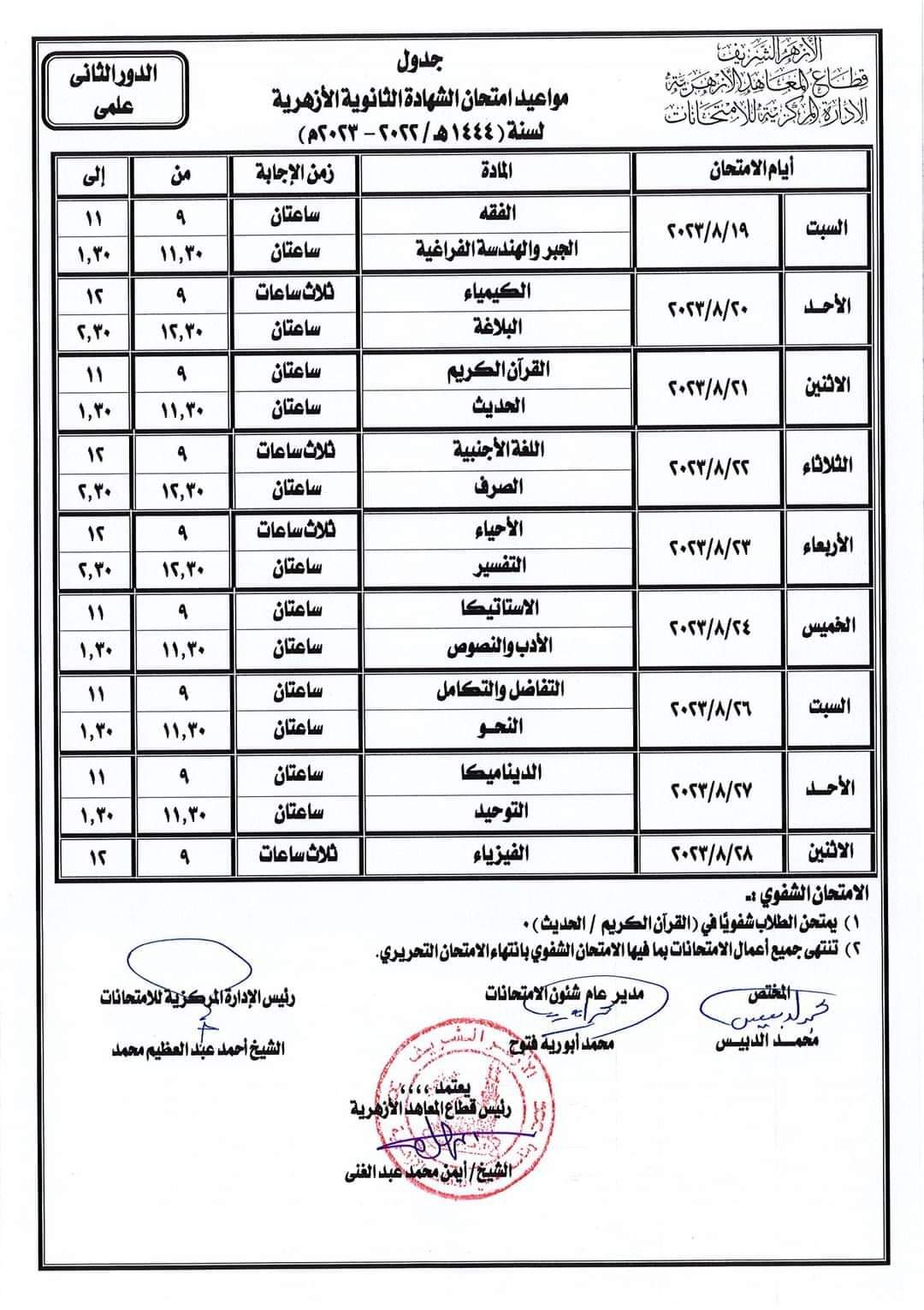 جدول امتحانات الدور الثاني لطلاب الشهادة الثانوية الأزهرية 2023 (صور)