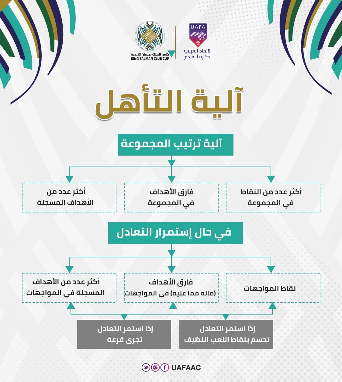 وفي حال استمرار التعادل يتم اللجوء لنقاط المواجهات وفارق الأهداف في المواجهات"ماله وما عليه" ثم أكثر عدد الأهداف المسجلة في المواجهات.