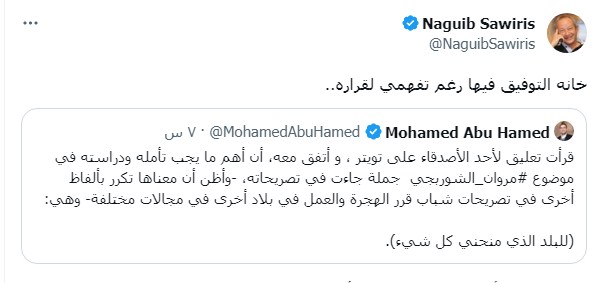 وجاء تعليق مهندس نجيب ساويرس ردًا على ما قاله السياسي محمد أبو حامد عن حديث مروان الشوربجي، حيث قال: "قرأت تعليق لأحد الأصدقاء على تويتر، وأتفق معه، أن أهم ما يجب تأمله ودراسته في موضوع #مروان_الشوربجي جملة جاءت في تصريحاته، -وأظن أن معناها تكرر بألفاظ أخرى في تصريحات شباب قرر الهجرة والعمل في بلاد أخرى في مجالات مختلفة- وهي: (للبلد الذي منحني كل شيء).