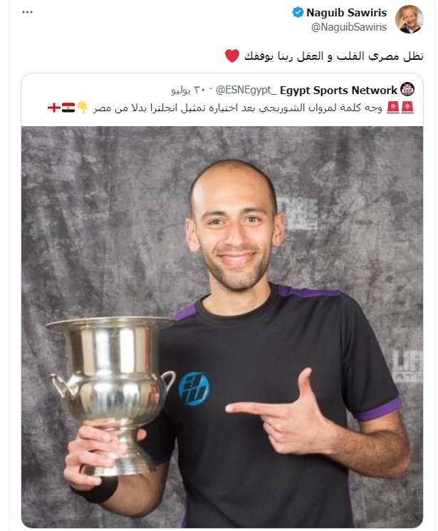 مروان الشوربجي، علق رجل الأعمال، مهندس نجيب ساويرس، على حديث لاعب الأسكواش مروان الشوربجي، بعد انضمامه للمنتخب الإنجليزي، مؤكدًا أن مروان الشوربجي "خانه التوفيق".