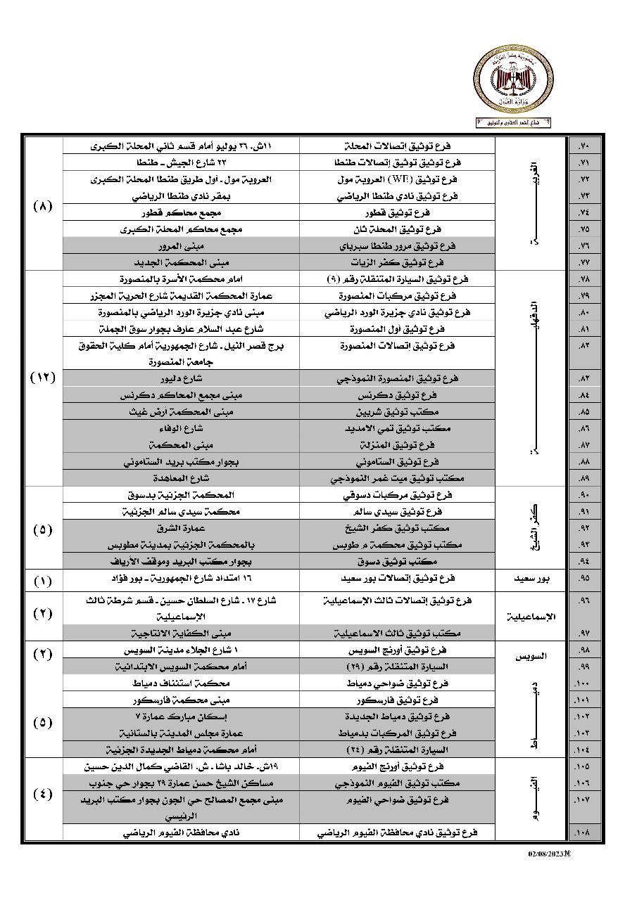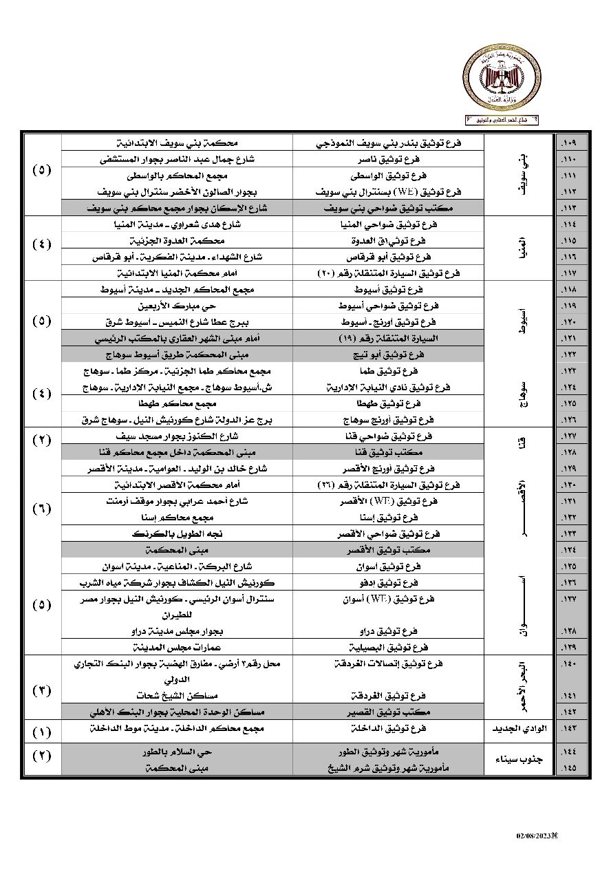 كما وجه وزير العدل بزيادة عدد الفروع التي تعمل بالفترة المسائية وذلك بإتاحة العمل في عدد (35) فرع موزعه على ( 19 ) محافظة وهي: (القاهرة – الجيزة – القليوبية – الشرقية – الغربية – دمياط – الدقهلية – جنوب سيناء – الاسكندرية – مطروح – السويس – كفر الشيخ – الإسماعيلية – أسيوط – البحر الأحمر – الفيوم – بني سويف – قنا – الأقصر)، ليصبح اجمالي عدد الفروع التي تعمل خلال الفترة المسائية عدد (145) فرع توثيق
