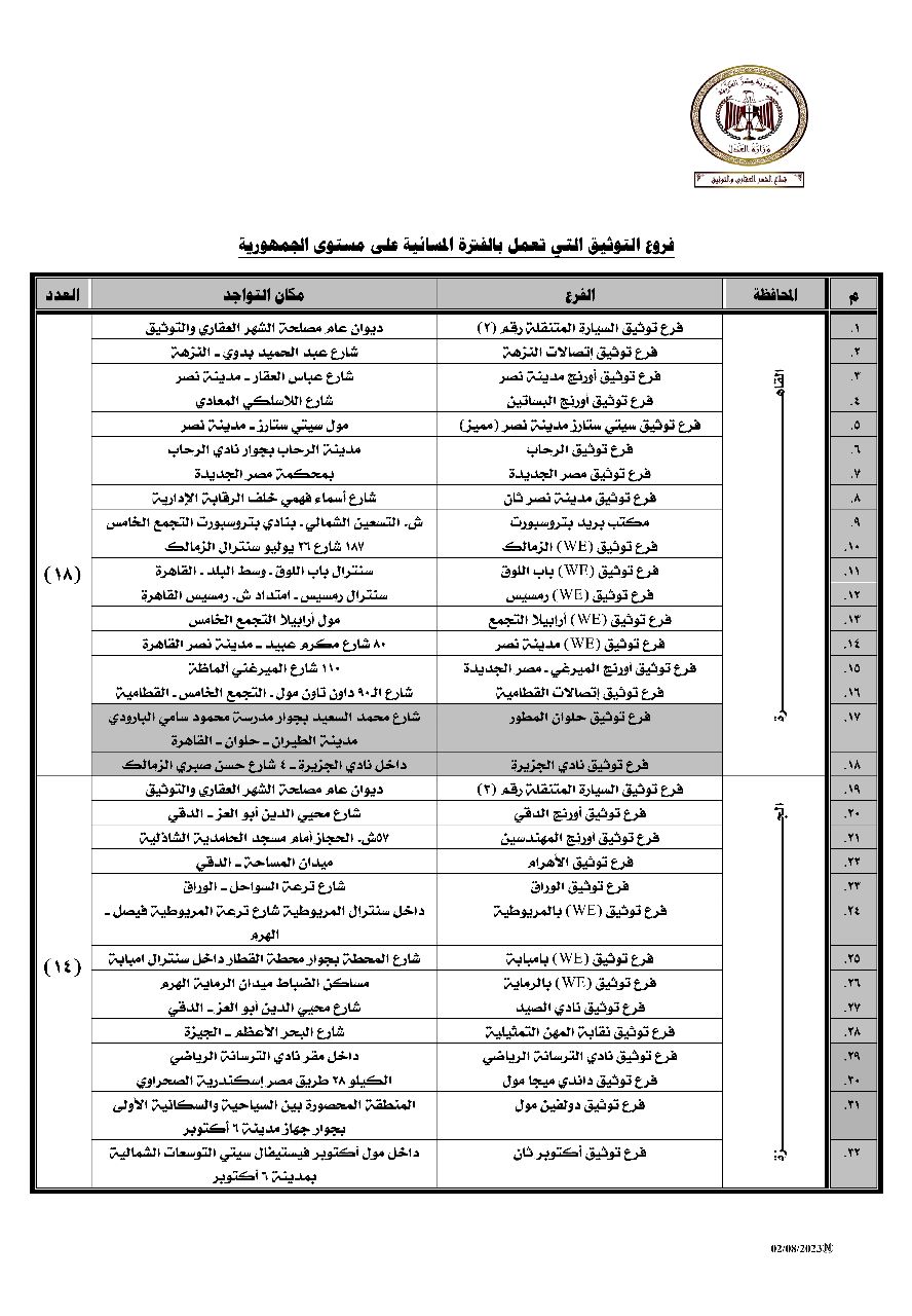 أعلنت وزارة العدل برئاسة المستشار عمر مروان فروع التوثيق التي تعمل بالفترة المسائية على مستوى الجمهورية.
