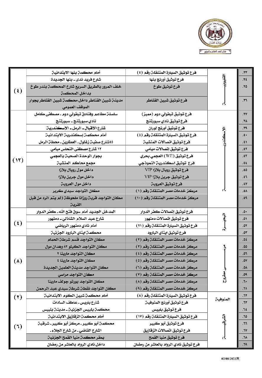 ووجه المستشار عمر مروان بتغطية الفروع المتنقلة الجديدة للخدمة في محافظتي الإسكندرية ومطروح على النحو الآتي: عدد 2 سيارة لمحافظة الإسكندرية (سيدي كرير -قرية روزانا)، و8 سيارات لمحافظة مطروح (قسم شرطة الحمام - الكيلو 82 "زهران مول" - مارينا 2 - مارينا 4 - مدينة العلمين الجديدة - بورتو جولف مارينا – مراسي - نقطة شرطة سيدي عبد الرحمن)، وبذلك أصبح إجمال عدد سيارات التوثيق المتنقلة التي تم الدفع بها بكافة محافظات الجمهورية (52) سيارة توثيق متنقلة.