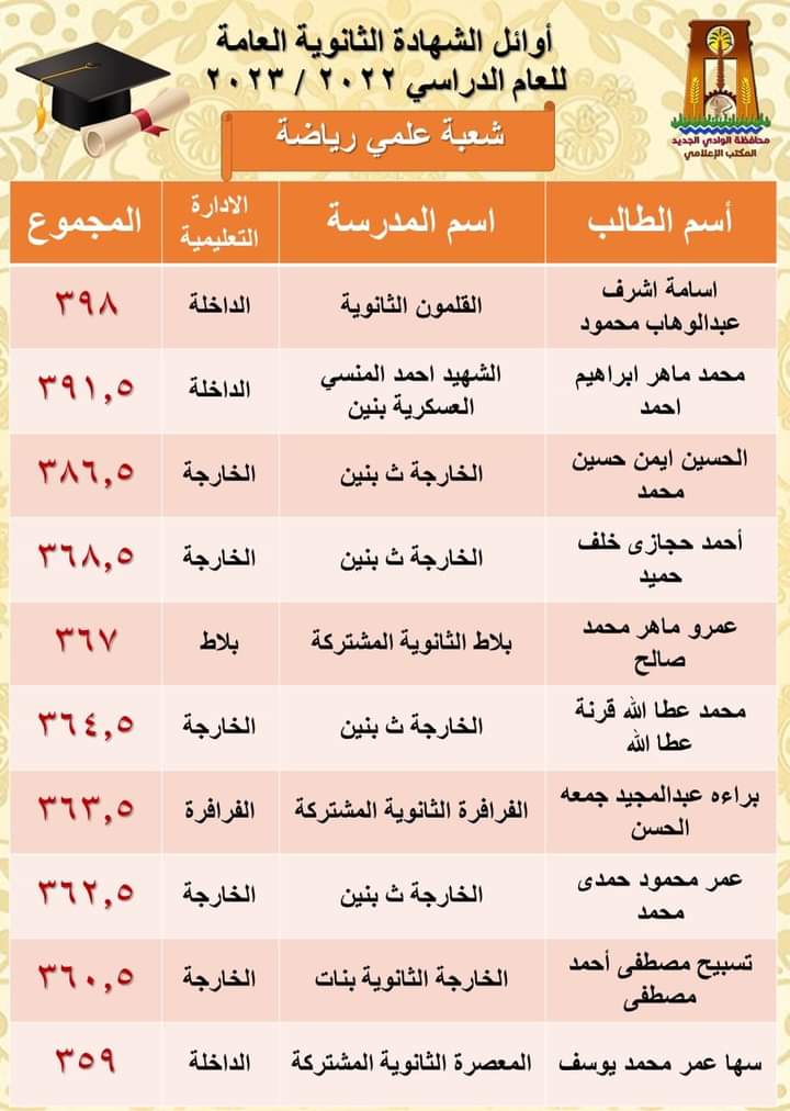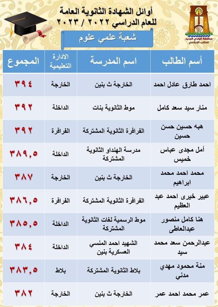 قدم اللواء دكتور محمد الزملوط محافظ الوادي الجديد، التهنئة لأوائل الشهادة الثانوية العامة على مستوى المحافظة بالشعبتين العلمية والأدبية لعام ٢٠٢٢ /٢٠٢٣.