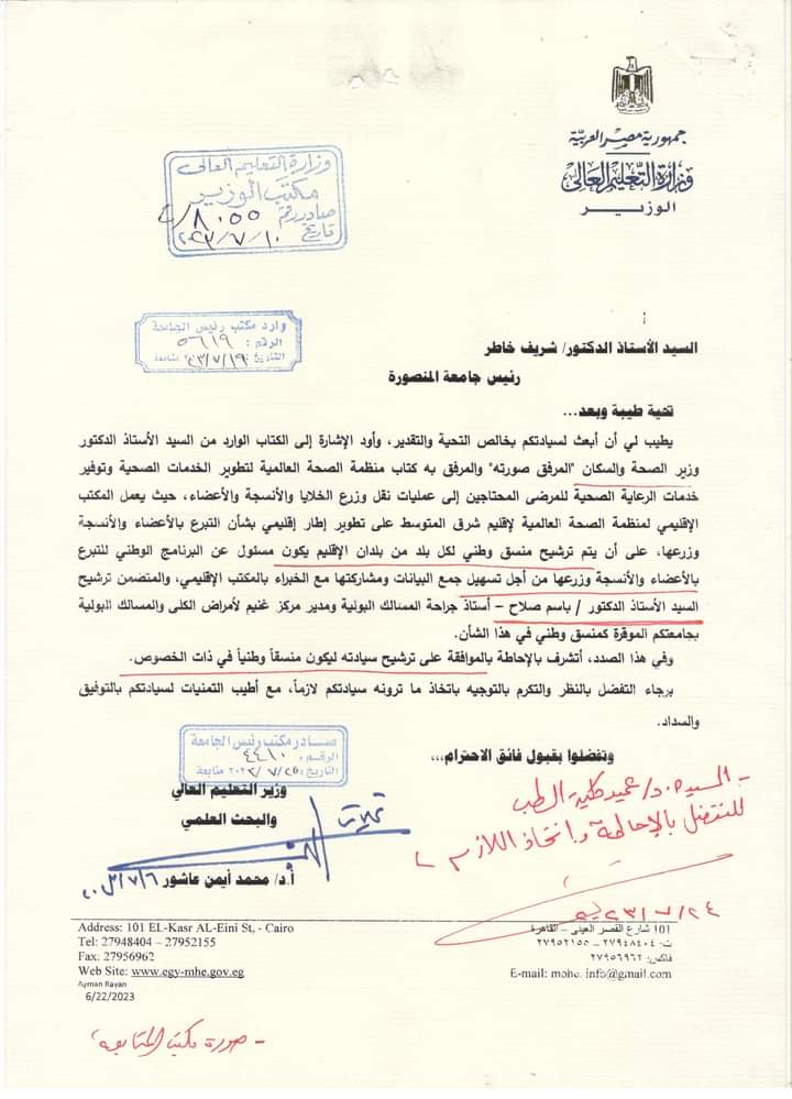 جاء ذلك بناء على ترشيح الدكتور شريف يوسف خاطر، رئيس جامعة المنصورة لمدير مركز جراحة الكلى والمسالك البولية، بشأن الكتاب الوارد من وزير الصحة والسكان والمرفق به كتاب منظمة الصحة العالمية لتطوير الخدمات الصحية وتوفير خدمات الرعاية الصحية للمرضى المحتاجين الى عمليات نقل وزرع الخلايا والأنسجة والأعضاء.