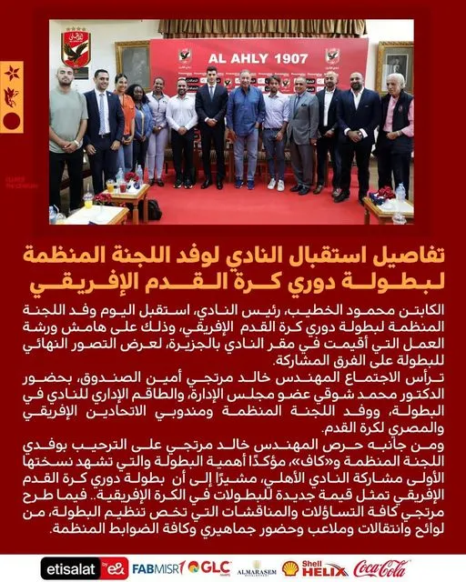 استقبل مجلس إدارة النادي الأهلي برئاسة محمود الخطيب الوفد المنظم لدوري كرة القدم الأفريقي أثناء تواجدهم في مقر النادي بالجزيرة لوضع التصور النهائي للبطولة ولكافة الفرق المشاركة.
