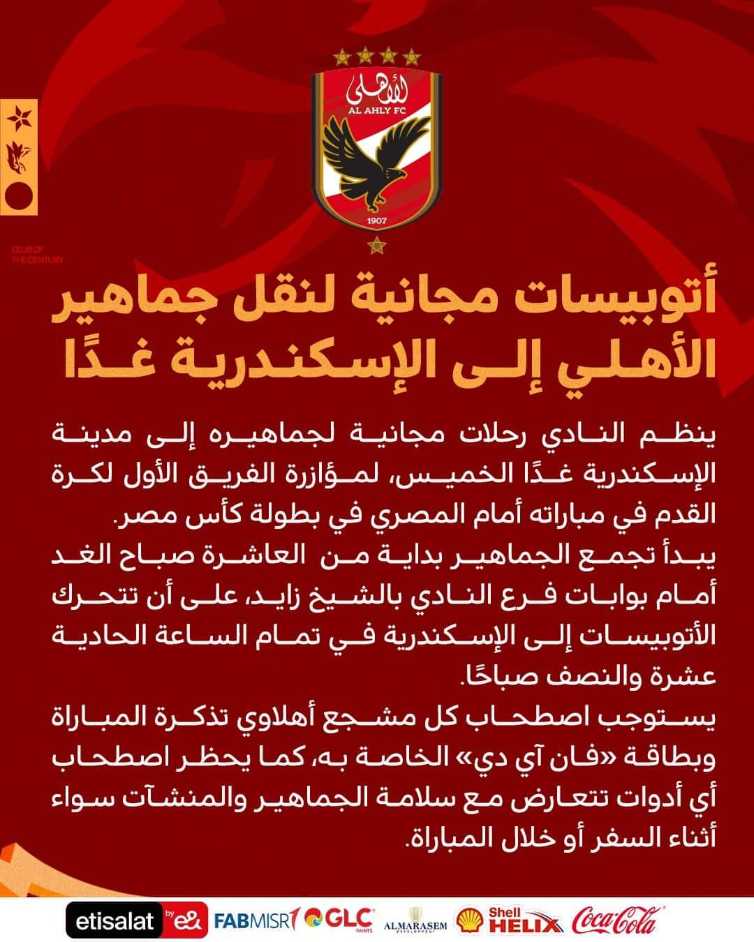 قرر مجلس إدارة النادي الأهلي، توفير رحلات مجانية لجماهيره إلى مدينة الإسكندرية لمؤازرة الفريق في مباراته أمام المصري البورسعيدي في المباراة التي ستقام علي ملعب ستاد برج العرب في دور ربع النهائي من بطولة كأس مصر.