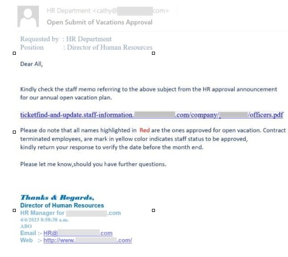 ووجدت خبراء امن المعلومات أن المجرمين السيبرانيين بعثوا رسائل مزيفة عبر البريد الإلكتروني تنتحل مراسلات الموارد البشرية خلال أشهر الصيف إلى الموظفين للحصول منهم على البيانات الخاصة بشركاتهم. وكان الهدف منها الإيقاع بالموظف من خلال الضغط على رابط التصيد.