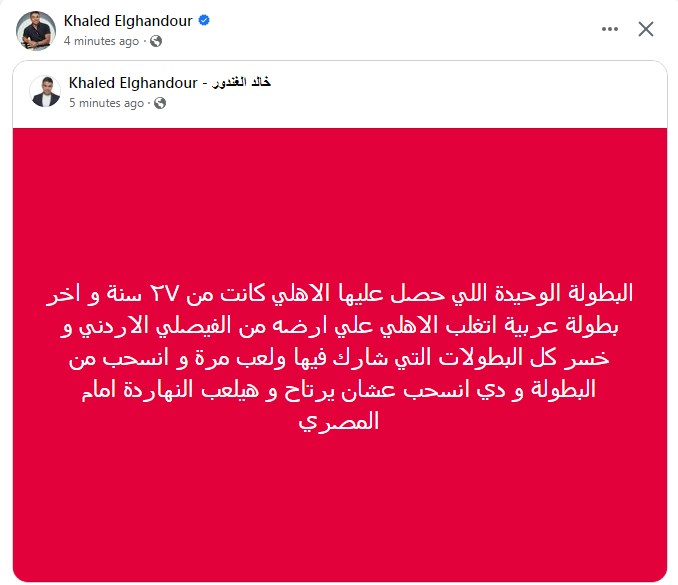 خالد الغندور، تسببت تدوينة للاعب الزمالك السابق، خالد الغندور، في استفزاز جماهير النادي الأهلي، وخاصة أن الغندور ذكر في تدوينته أن "البطولة الوحيدة التي حصل عليها الأهلي كانت منذ 27 عامًا، وآخر بطولة عربية هُزم فيها على أرضه من نادي الفيصلي الأردني"