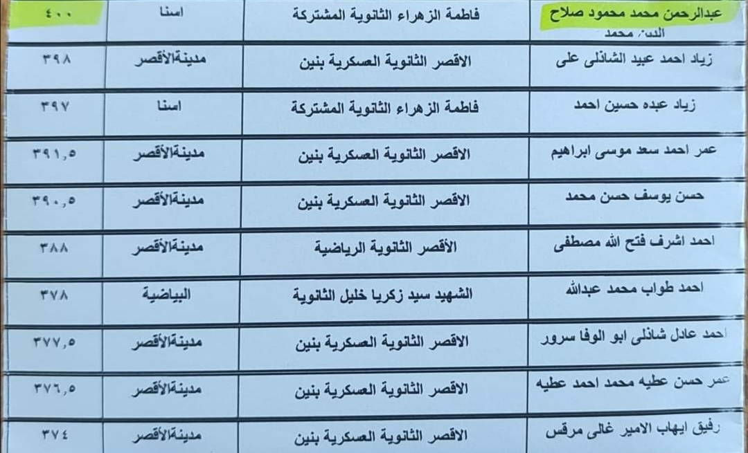 أعلنت مديرية التربية والتعليم بمحافظة الأقصر، أسماء أوائل الشهادة الثانوية العامة، للعام الدراسي ٢٠٢٢ /٢٠٢٣.
