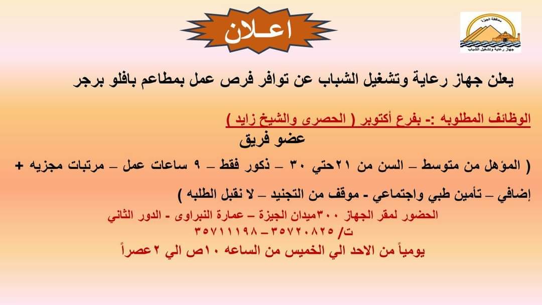 أعلن جهاز تشغيل الشباب بالجيزة عن توافر فرصة عمل بمطاعم بافلو برجر.
