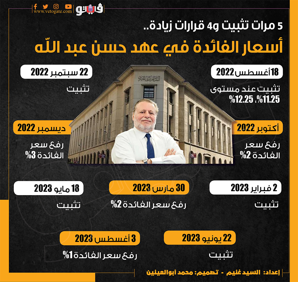 5 مرات تثبيت و4 قرارات زيادة.. أسعار الفائدة في عهد حسن عبد الله (إنفوجراف) الجمعة 04/أغسطس/2023 - 05:43 م 8/4/2023 5:43:18 PM أسعار الفائدة في عهد حسن عبد الله، فيتو السيد غنيم شارك طباعة 18 حجم الخط شارك طباعة أسعار الفائدة حسن عبد الله محافظ البنك المركزي
