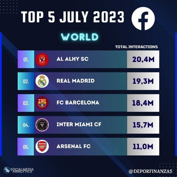 وحقق النادي الأهلي 20.4 مليون تفاعل عبر صفحته الرسمية على منصة فيس بوك، ليحتل المركز الأول في قائمة أفضل 5 أندية على مستوى العالم في شهر يوليو الماضي.