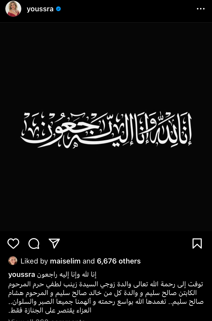 وكتبت يسرا قائلة: "إنا لله وإنا إليه راجعون، توفيت إلى رحمة الله تعالى والدة زوجي السيدة زينب لطفي حرم المرحوم الكابتن صالح سليم ووالدة كل من خالد صالح سليم والمرحوم هشام صالح سليم".