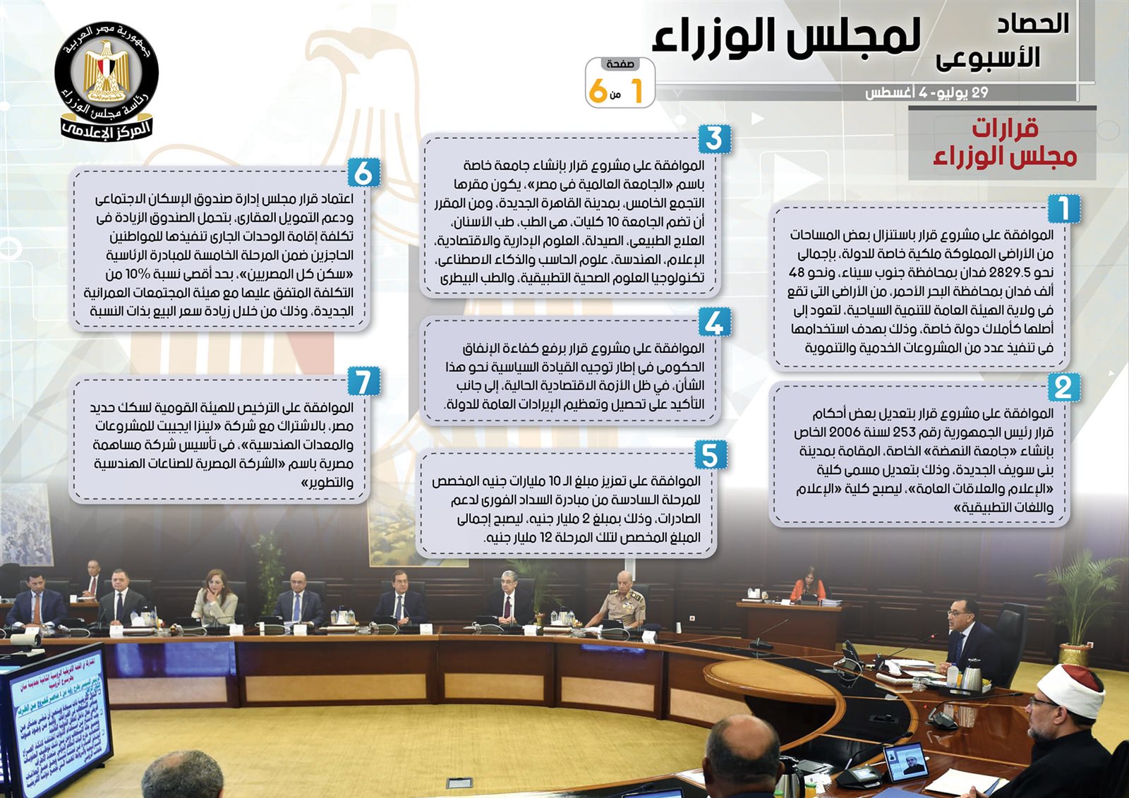 الحصاد الأسبوعي لمجلس الوزراء، إنشاء جامعة خاصة باسم "الجامعة العالمية في مصر" (إنفوجراف)