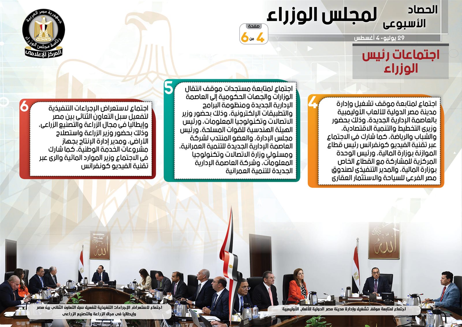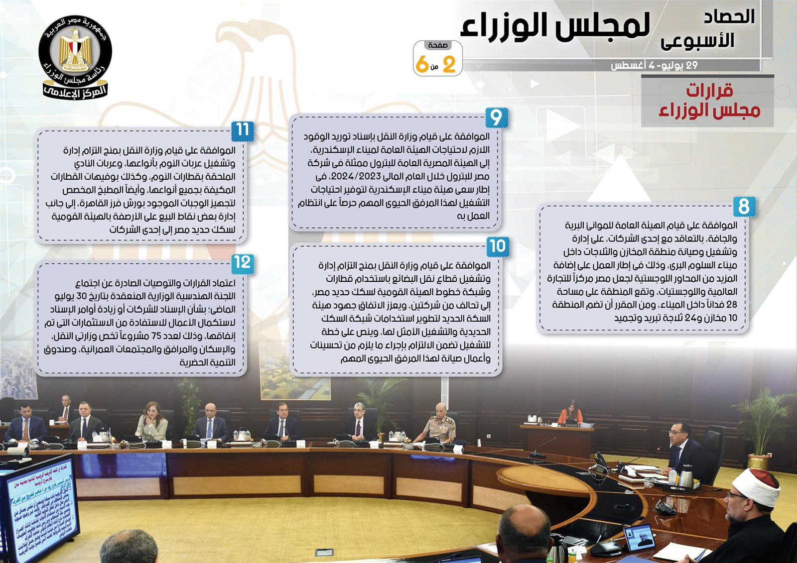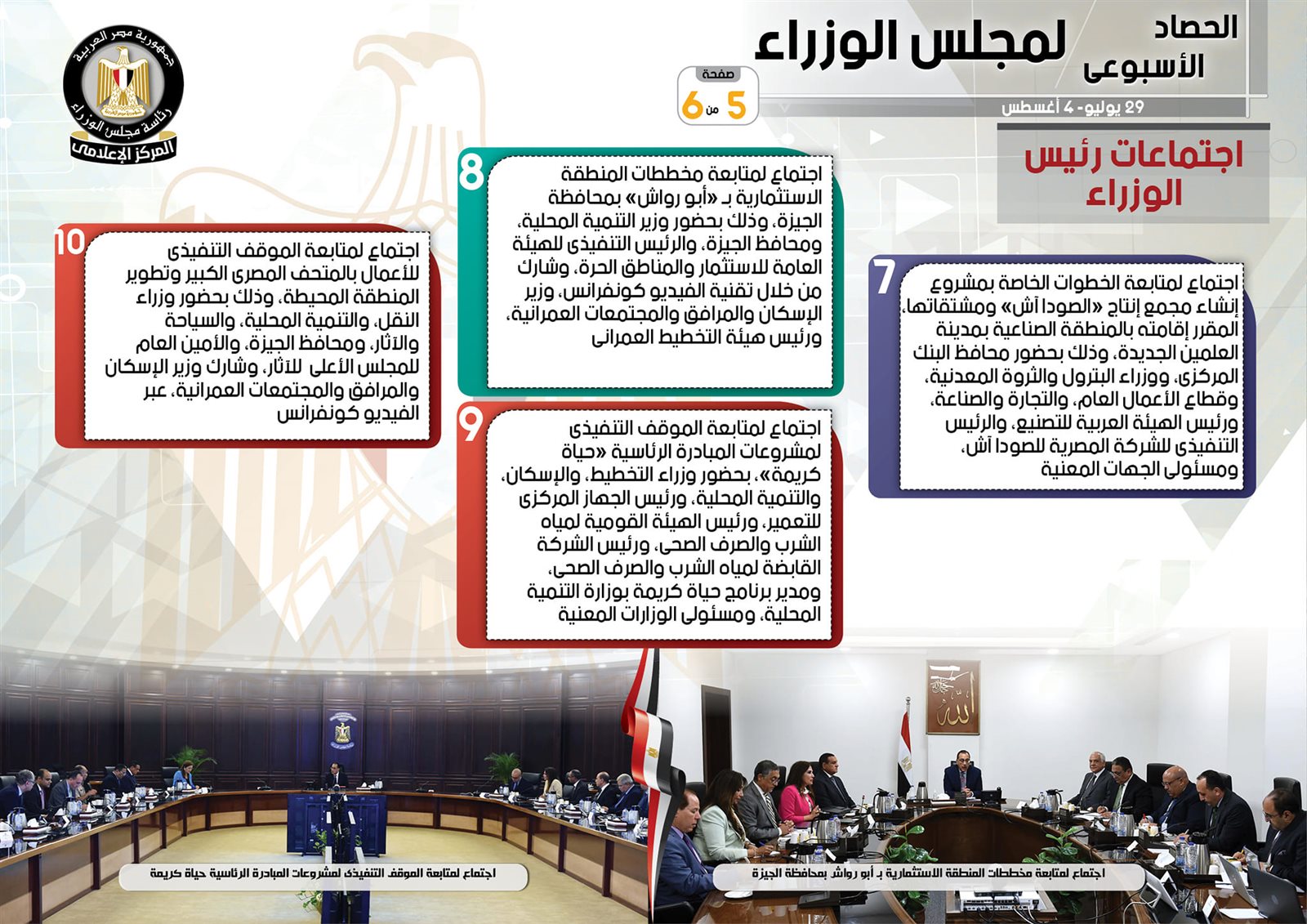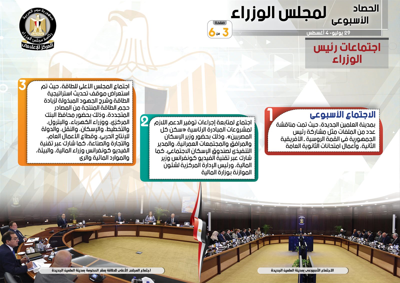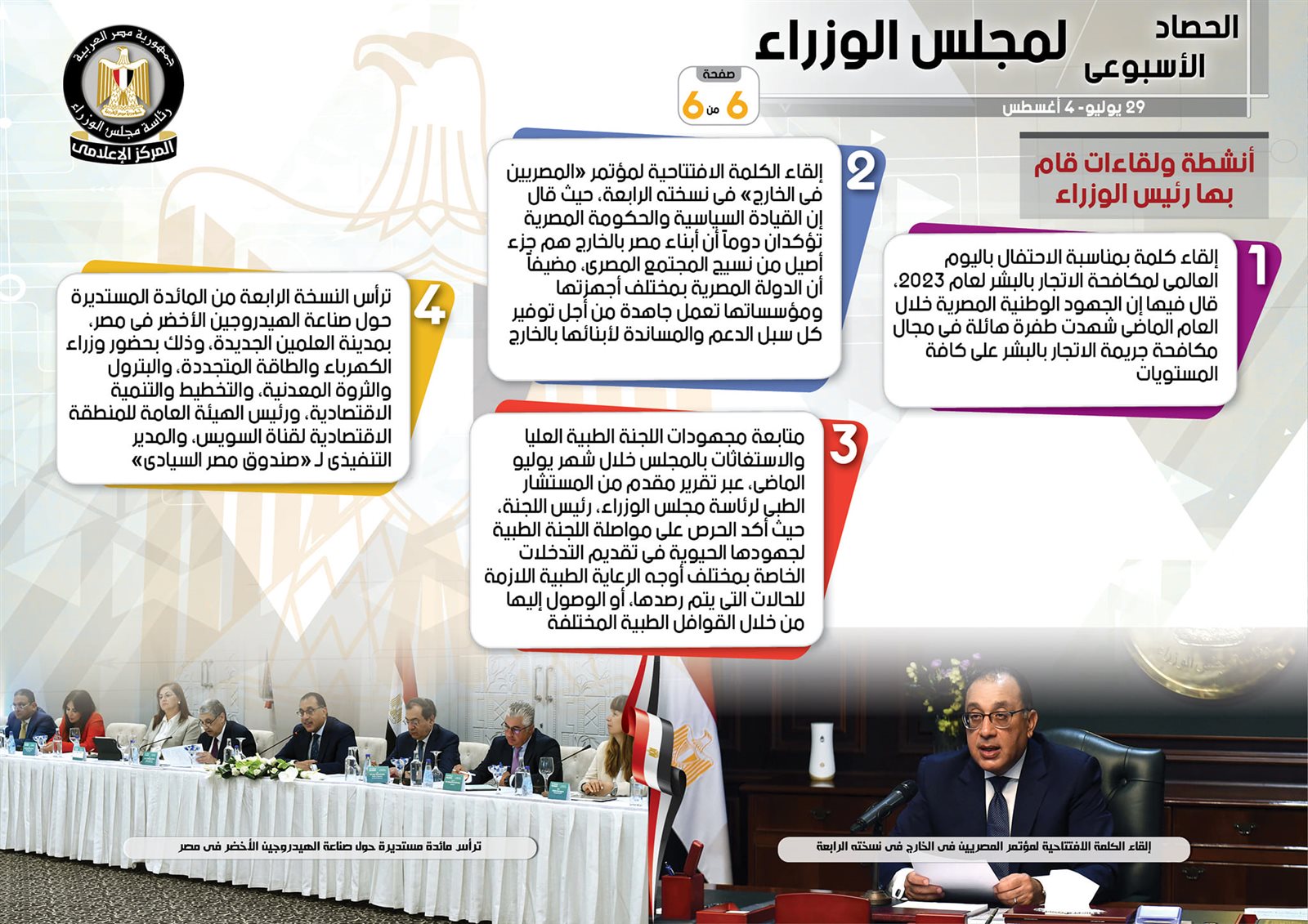 نشر المركز الإعلامي لمجلس الوزراء، تقريرًا شمل إنفوجرافات سلط من خلالها الضوء على الحصاد الأسبوعي لمجلس الوزراء، وذلك خلال الفترة من 29 يوليو حتى 4 أغسطس 2023، والذي تضمن الموافقة على عدد من القرارات، فضلًا عن الاجتماعات التي عقدها الدكتور مصطفى مدبولي، رئيس مجلس الوزراء، بالإضافة إلى ما قام به سيادته من أنشطة.