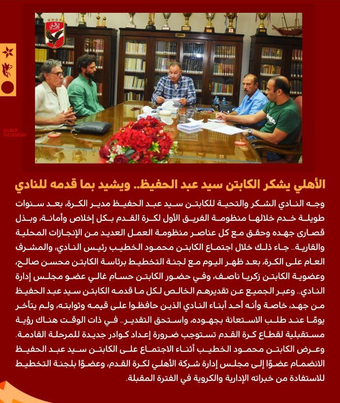 وعرض الكابتن محمود الخطيب أثناء الاجتماع على الكابتن سيد عبد الحفيظ الانضمام عضوًا إلى مجلس إدارة شركة الأهلي لكرة القدم وعضوًا بلجنة التخطيط للاستفادة من خبراته الإدارية والكروية في الفترة المقبلة.