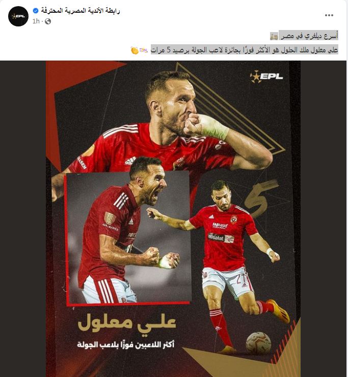 ونشر الحساب الرسمي لرابطة الأندية المحترفة على فيسبوك صورة علي معلول وعلق عليها: “أسرع ديلفري في مصر.. علي معلول ملك الحلول هو الأكثر فوزًا بجائزة لاعب الجولة برصيد 5 مرات ”.