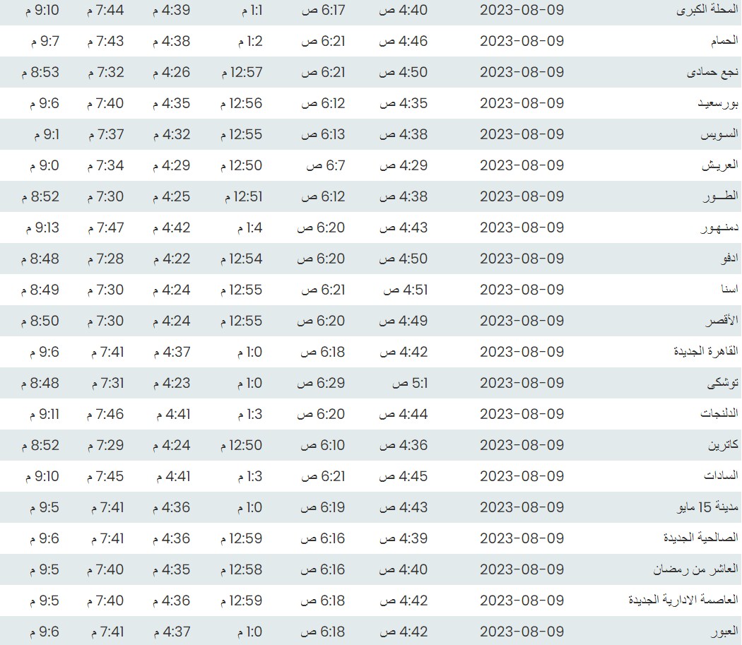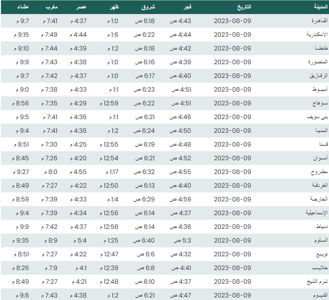مواقيت الصلاة اليوم وفقًا للتوقيت المحلي لمدينتي القاهرة والإسكندرية وعدد من مدن ومحافظات الجمهورية من واقع بيانات الهيئة العامة للمساحة