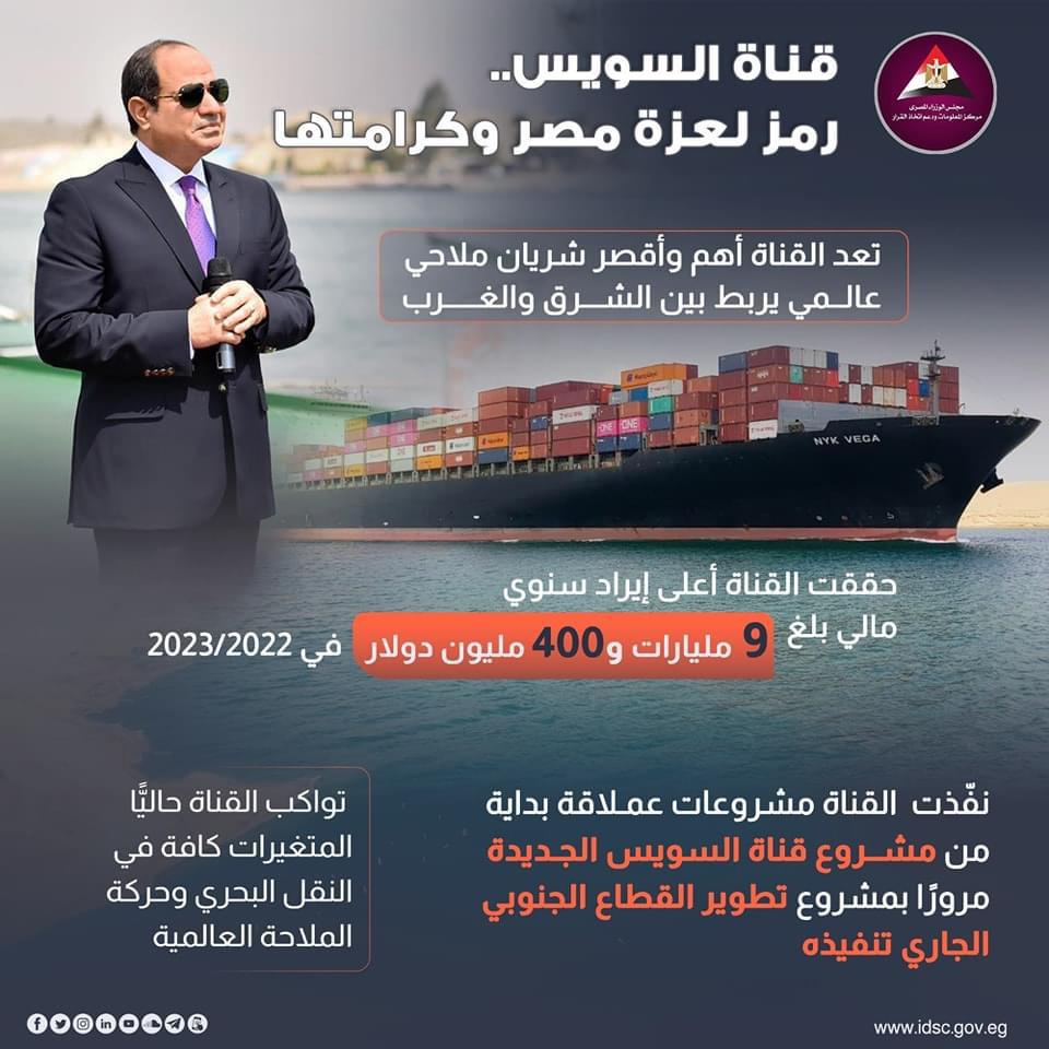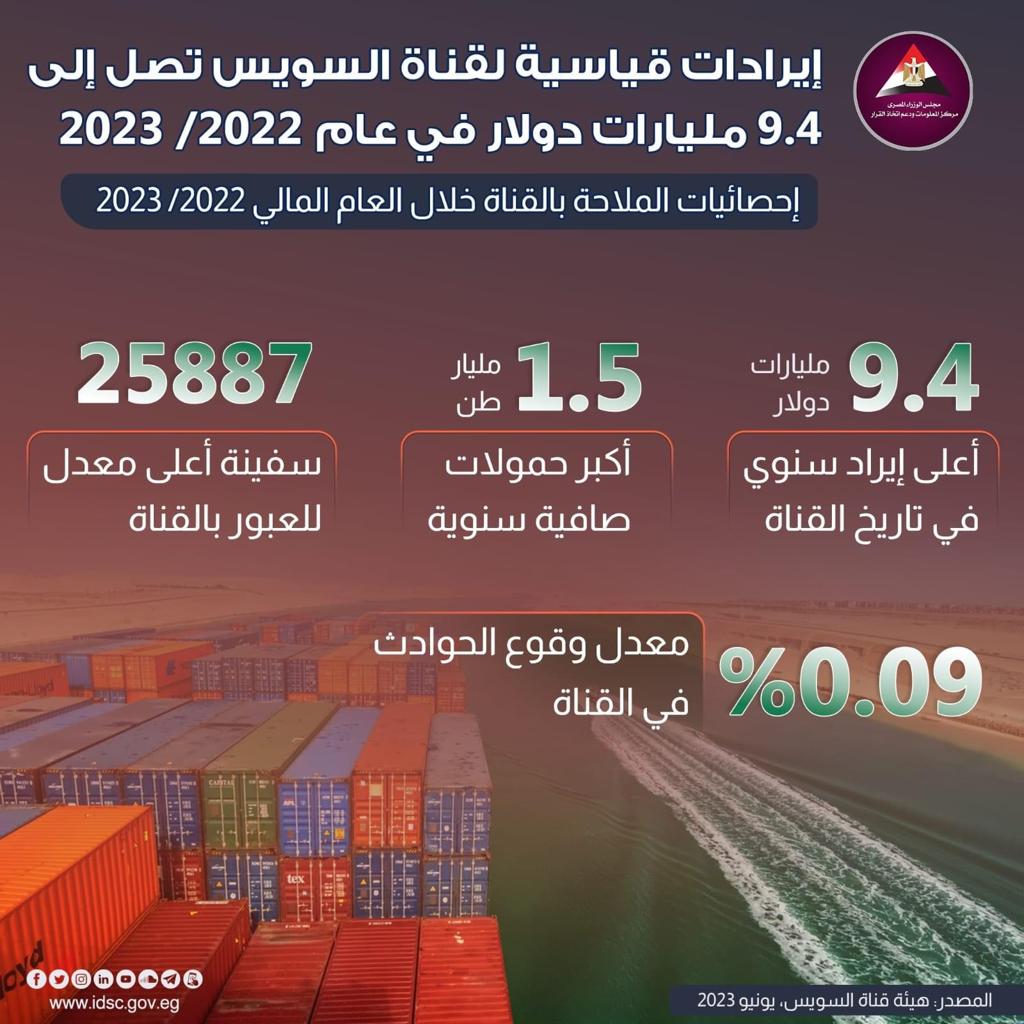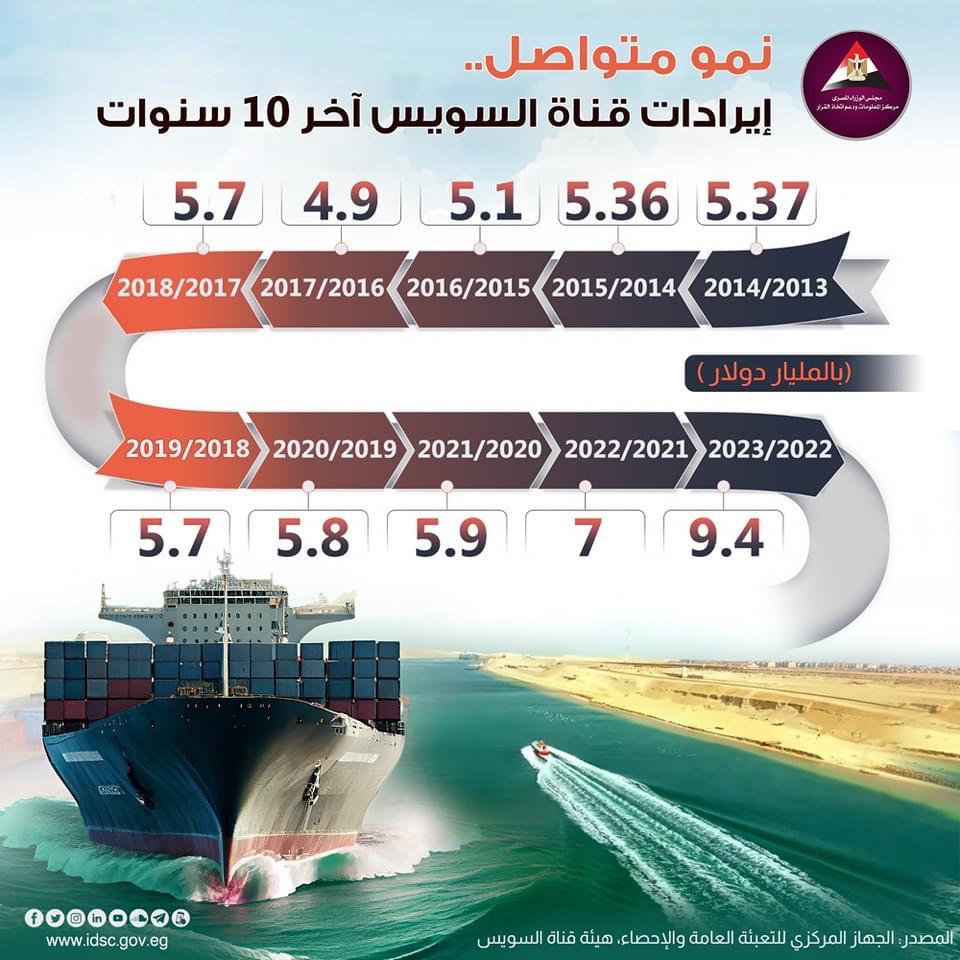 وشهدت القناة منذ تأميمها مرور أكثر من 31 مليار طن من البضائع محققة دخلًا تجاوز الـ 143 مليار دولار، لكنها منذ العام الماضي تحلق منفردة بأرقام غير مسبوقة لتصل الى 9.4 مليار دولار في السنة المالية 2022/2023 وهو أكبر دخل حققته القناة في تاريخها.