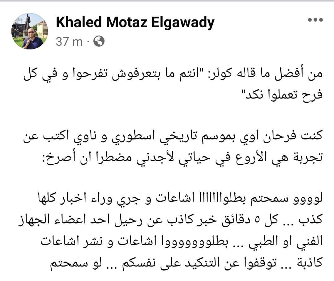 وواصل الجوادي: كنت ناوي بموسم تاريخي أسطوري وناوي أكتب عن تجربة هي الأروع في حياتي لأجدني مضطر أن أصرخ، لو سمحتم بطلوا إشاعات وجري وراء أخبار كلها كذب، كل ٥ دقائق خبر كاذب عن رحيل أحد أعضاء الجهاز الفني أو الطبي بطلوا إشاعات أوقفوا النكد "