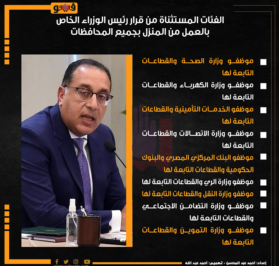 الفئات المستثناة من قرار رئيس الوزراء الخاص بالعمل من المنزل بجميع المحافظات (إنفوجراف) الأحد 06/أغسطس/2023 - 11:51 ص 8/6/2023 11:51:21 AM الدكتور مصطفى مدبولي رئيس الوزراء،فيتو أحمد عبدالمحسن شارك طباعة 18 حجم الخط شارك طباعة البنك المركزى المصرى الخدمات التامينية عمل من المنزل وزارة الكهرباء وزارة الصحة وزارة التضامن الاجتماعي