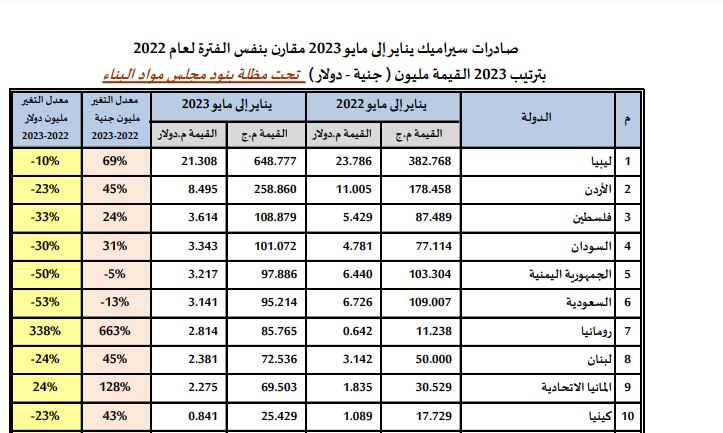 تراجعت صادرات السيراميك خلال الفترة من "يناير إلى مايو 2023 بنسبة -20%، لتصل إلى 58 مليون دولار، مقابل 72 مليون دولار خلال نفس الفترة من 2022، ويأتي ذلك طبقا للتقرير الشهري الصادر عن المجلس التصديري لمواد البناء.